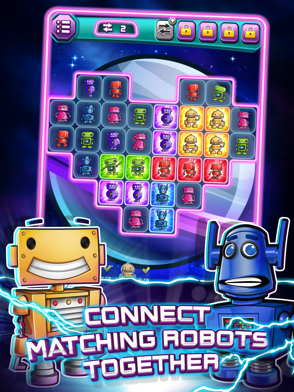 ● PUZZLES: connect matching robots together to energize to the next level