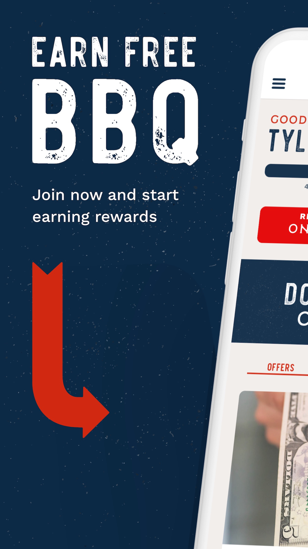 • Earn rewards for eating BBQ: one point for every $1 spent, every 100 points = $5 in free BBQ