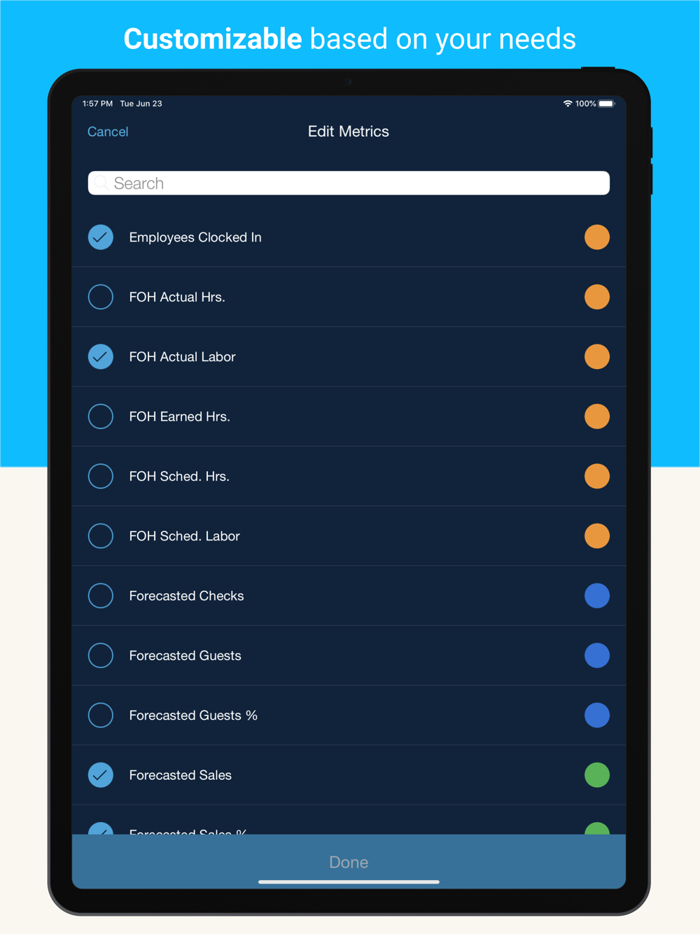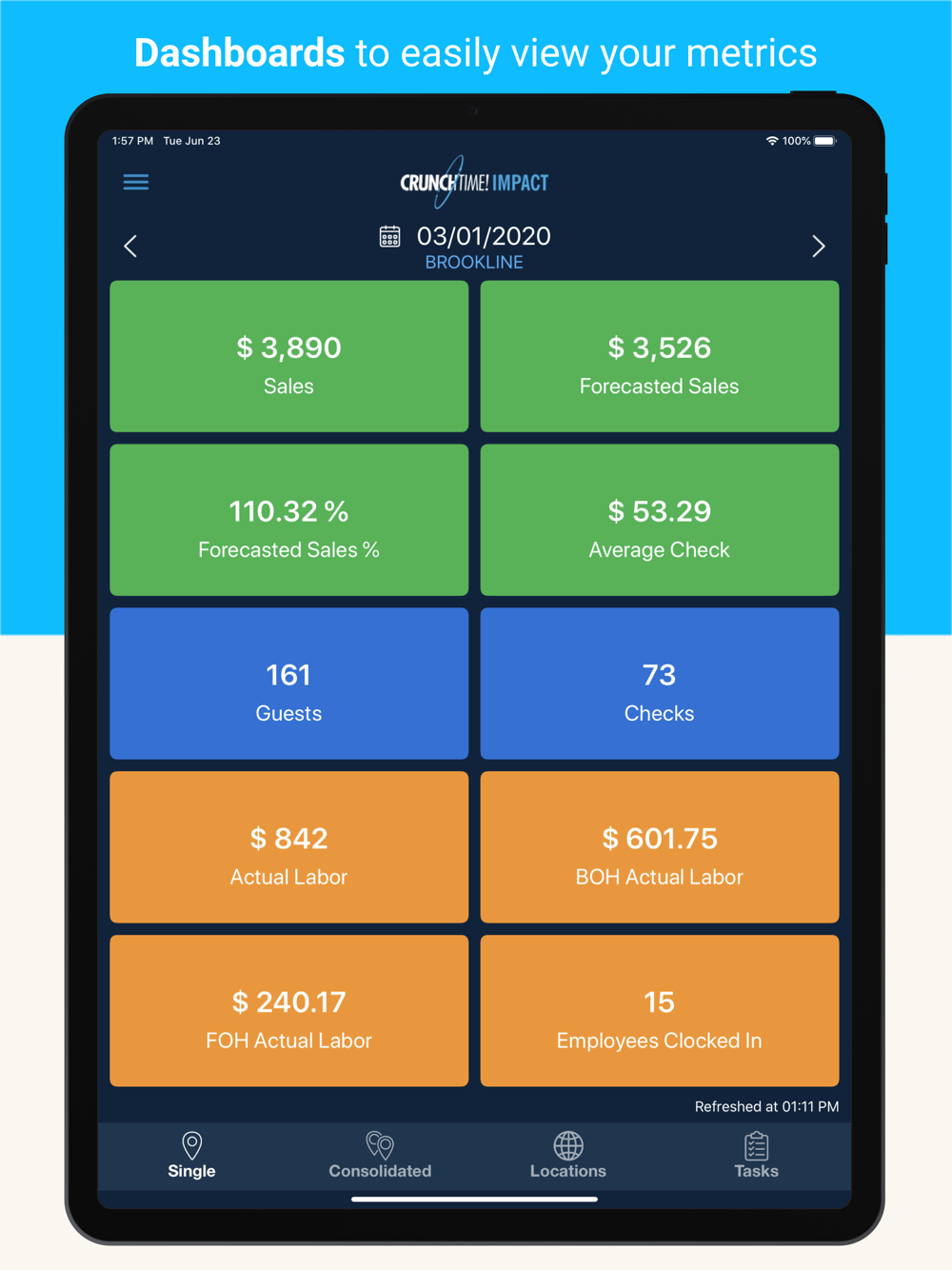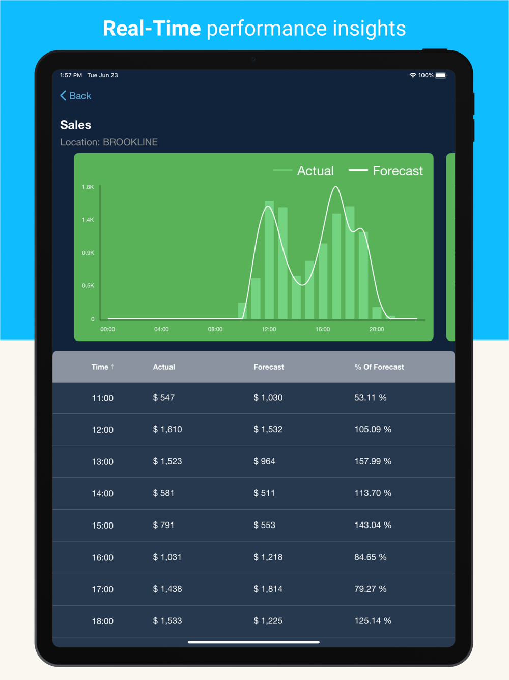 Monitor restaurant sales, food and labor costs, guest counts, labor costs, and so much more. Track real-time performance from the consolidated brand level down to each location. Quickly detect high-achievers and under-performers.