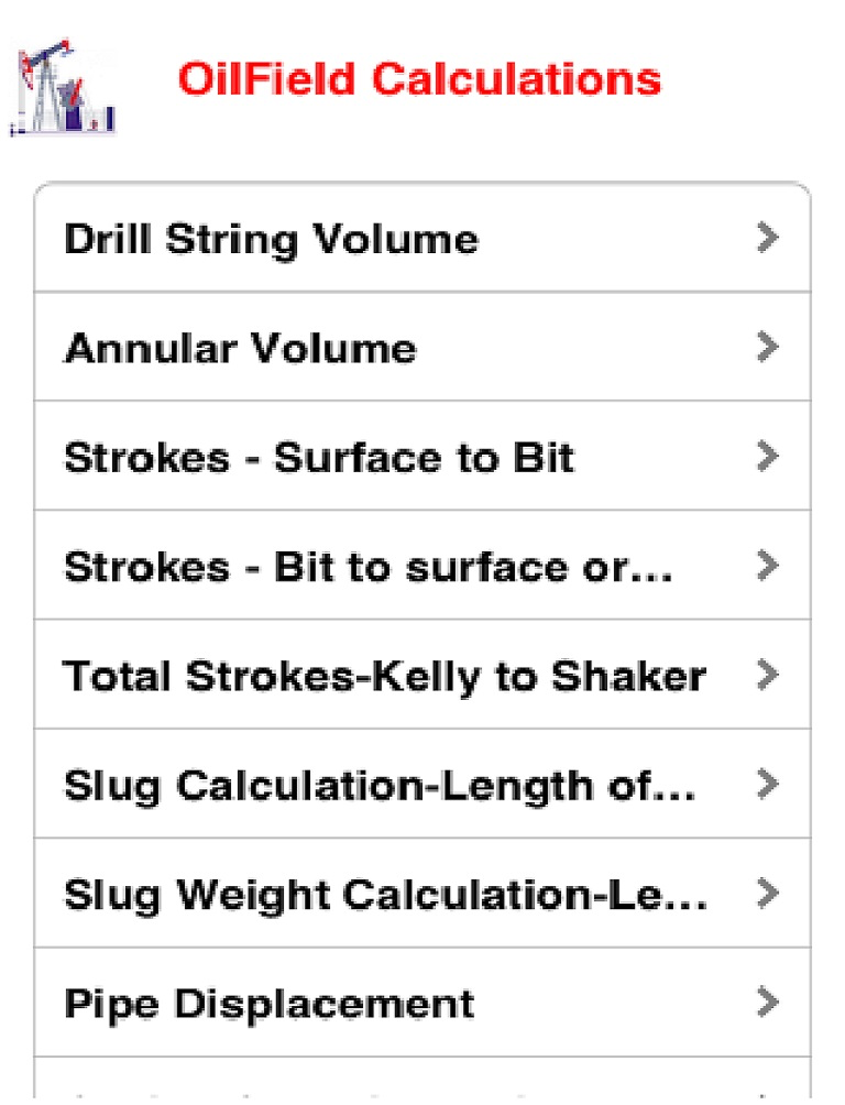 Annular Volume in bbls, Strokes – Surface to Bit,Strokes – Bit to surface or “Bottoms Up”,Total Stokes – Kelly to Shaker, Slug Calculation – Length of DRY Pipe, Slug Weight Calculation – Length of DRY Pipe, Accumulator Capacity — Usable Volume Per Bottle, Control Drilling – Maximum Drilling Rate feet per hour, Bulk Density of Cuttings (Using Mud Balance), Drill String Design (Limitations), Ton-Mile (TM) Calculations, Cementing Calculations, Weighted Cement Calculations, Calculations for the Number of Sacks of Cement Required, Calculations for the Number of Feet to Be Cemented, Setting a Balanced Cement Plug, Increase Oil/Water Ratio,