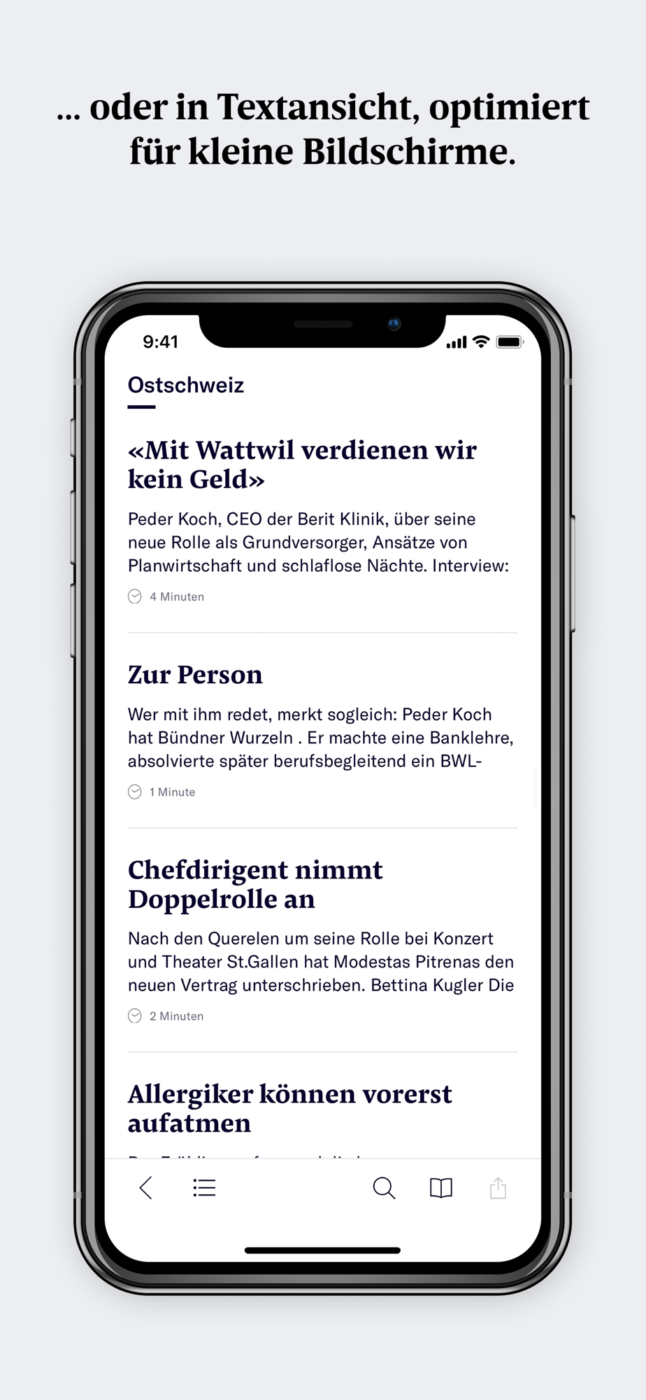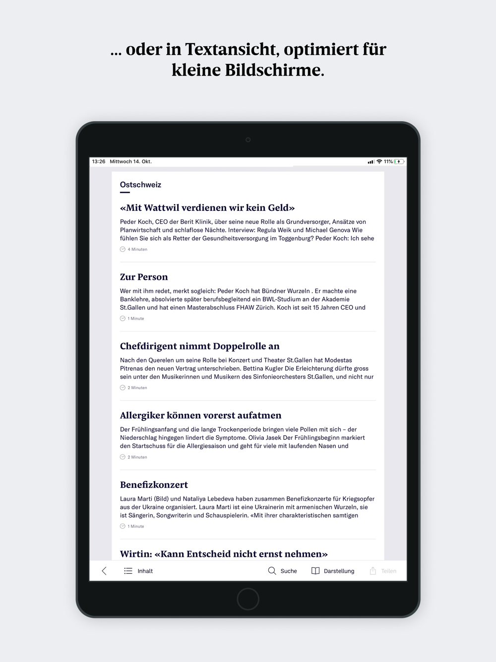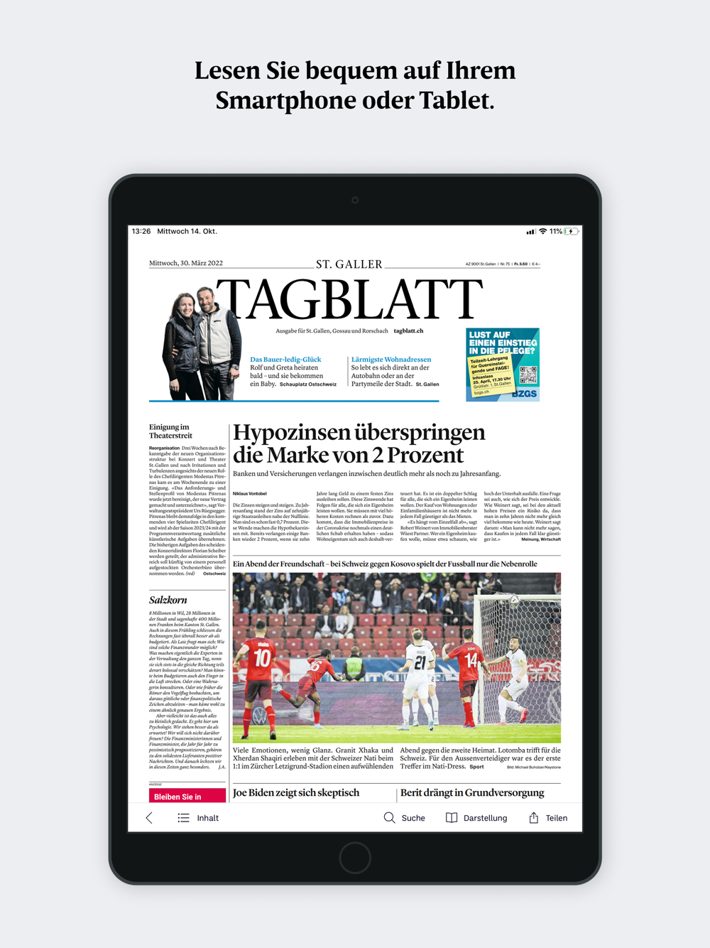 Das E-Paper ermöglicht Ihnen das Lesen wahlweise im Zeitungslayout oder in der mobilen Leseansicht auf Ihrem iPhone und iPad. Durch einfaches Antippen wechseln Sie die optimierte Darstellung für verschiedene Bildschirmgrössen.