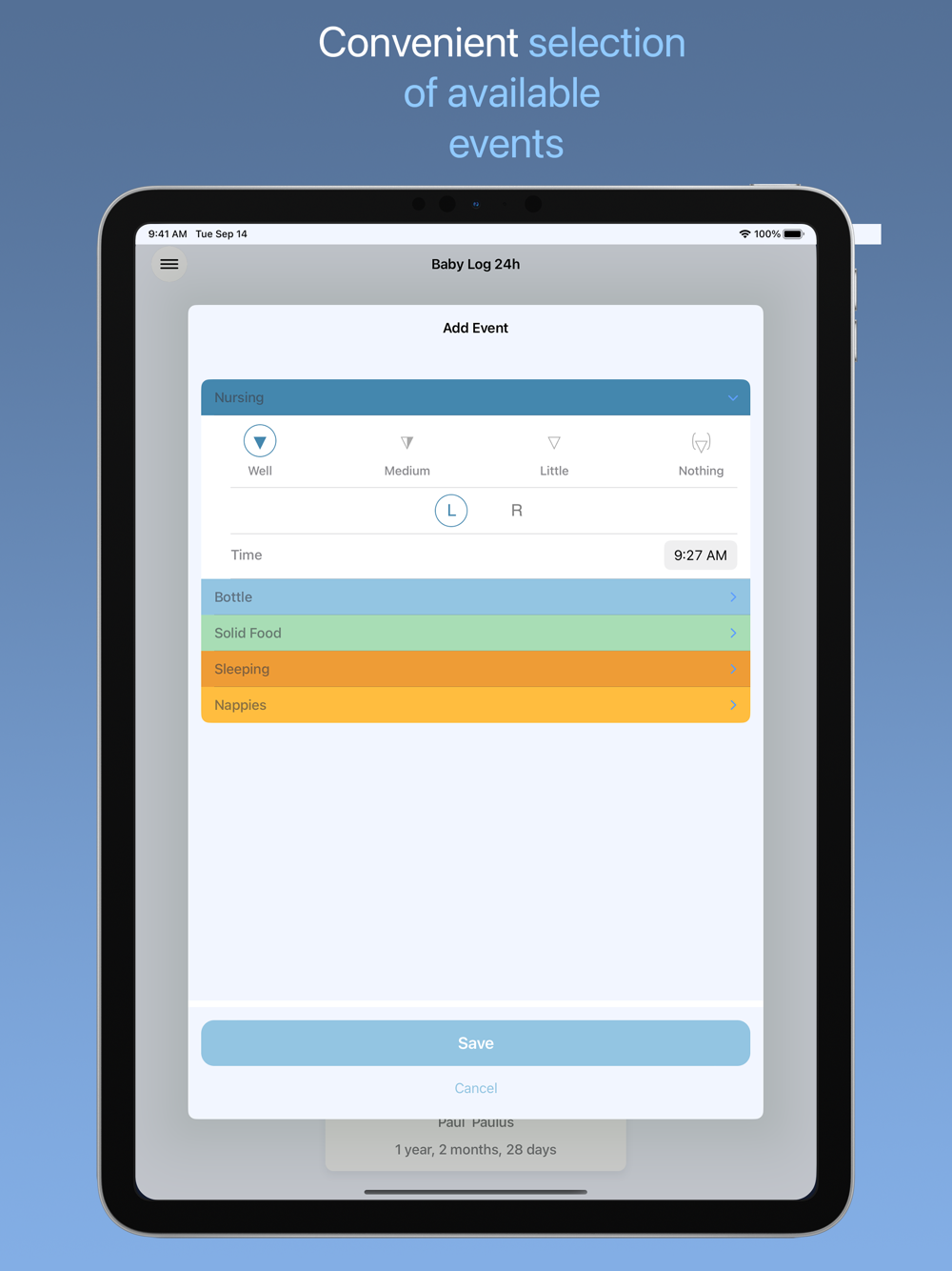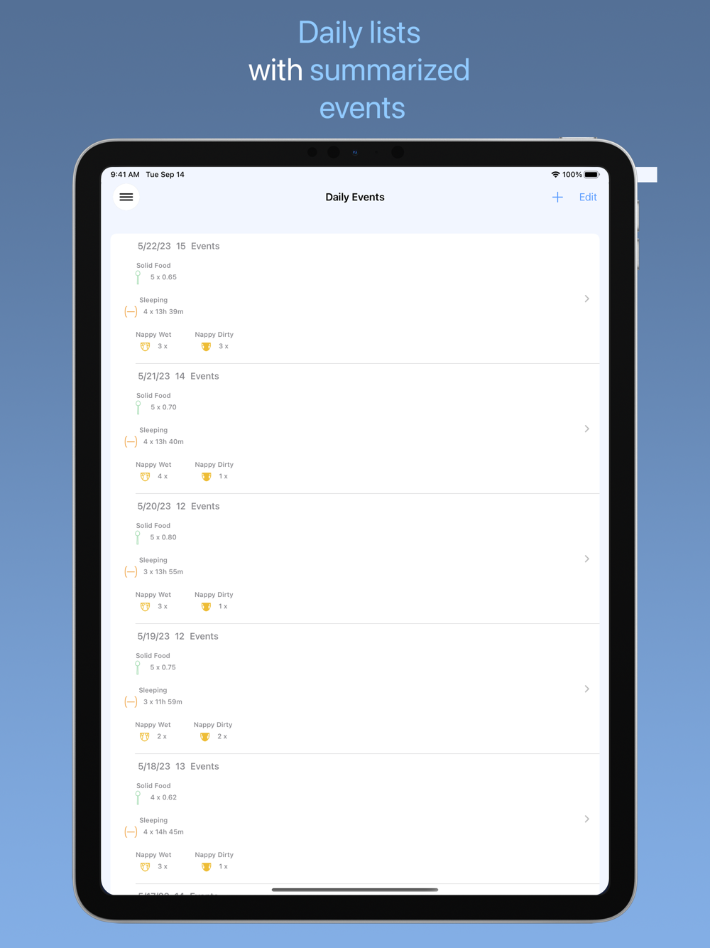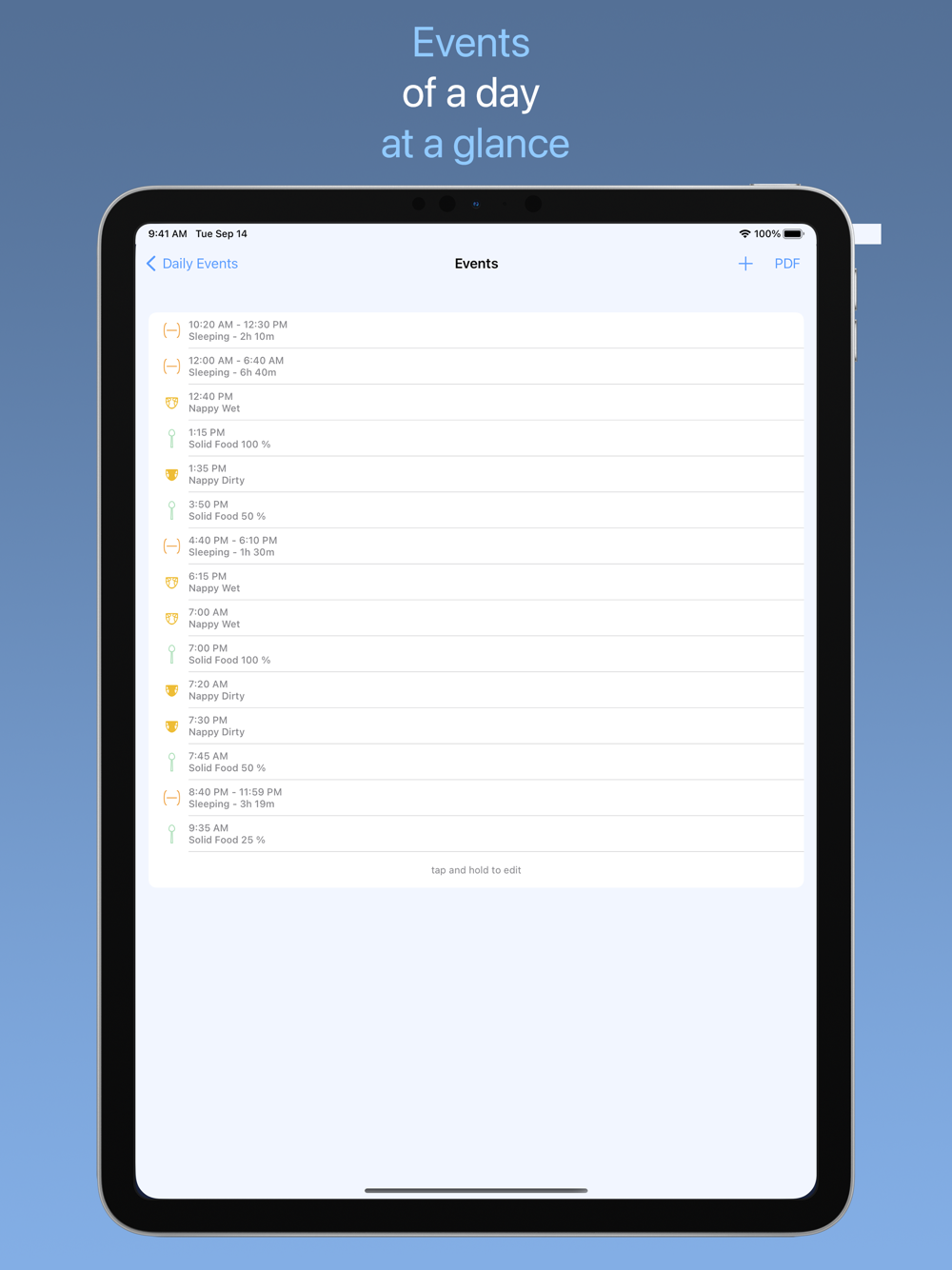 Built for fast and easy Event input from the home screen, the 14 days protocol screen and the daily events screen as well as the Apple Watch.