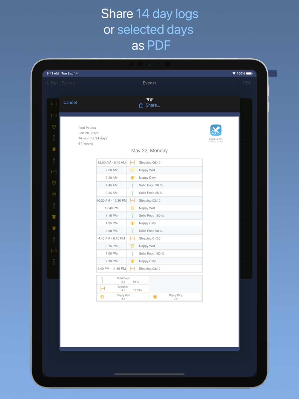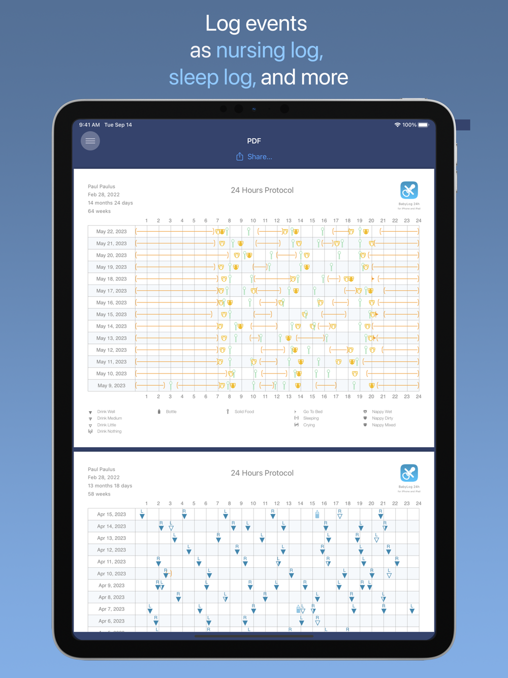 Standardized 24 hours protocol for breastfeeding, feeding, diapers and sleep with 14 days overview - as recommended by many midwives, pediatricians and sleep laboratories.