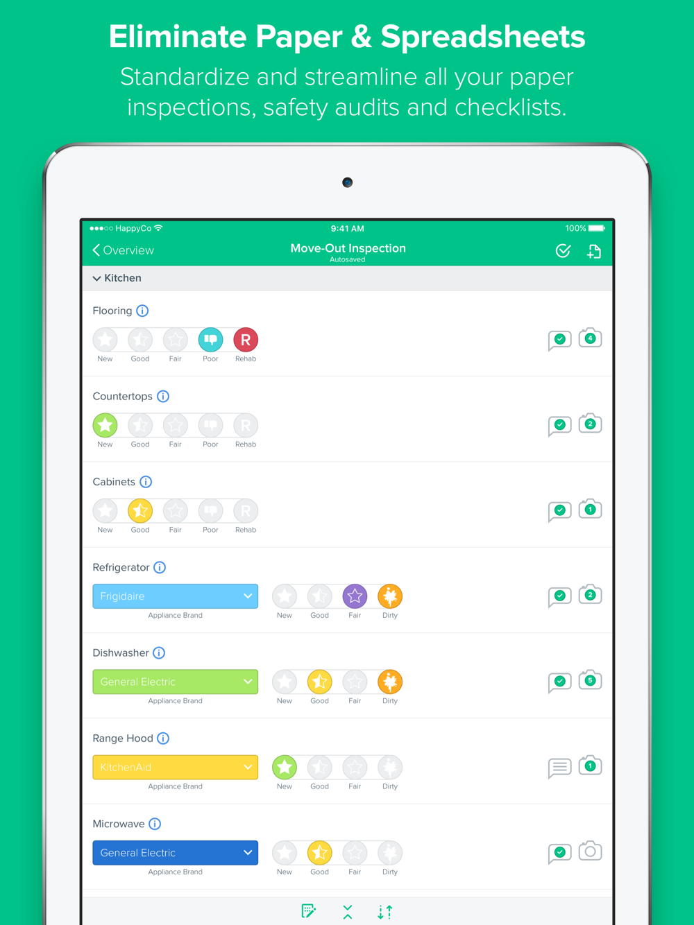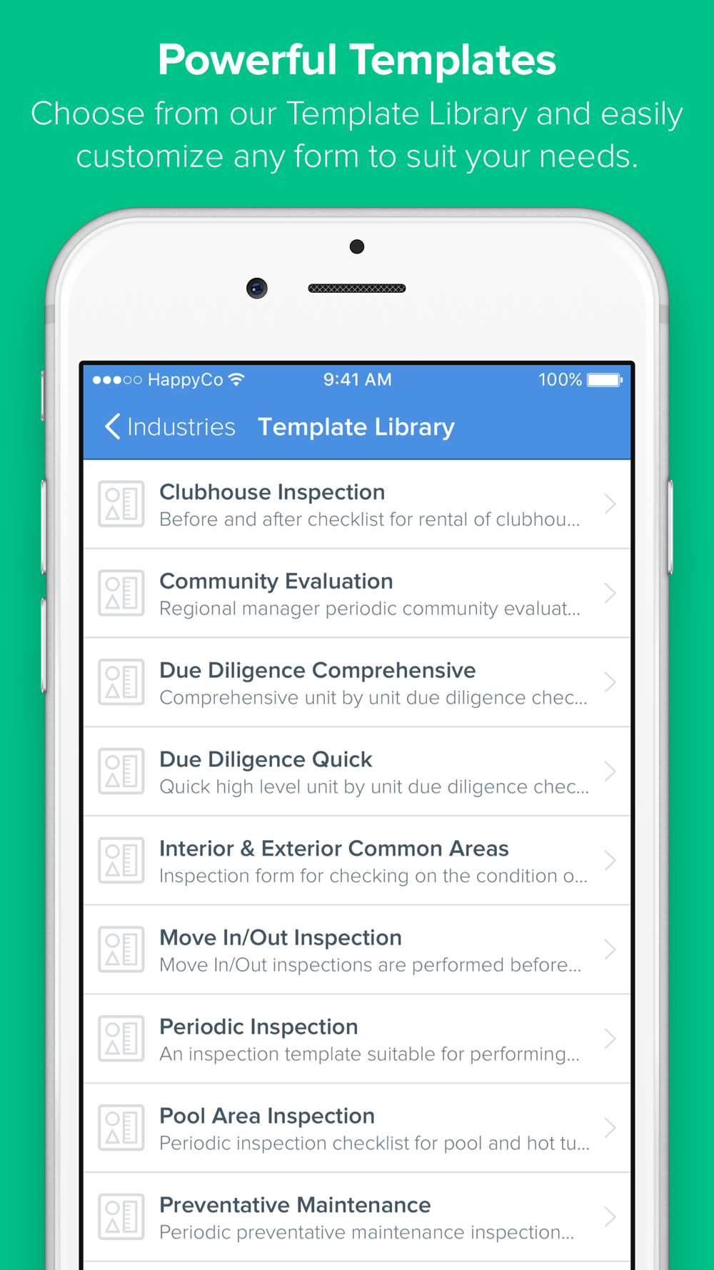 Inspections by HappyCo comes complete with fully customizable forms that adapt to your business requirements as well as your property and unit layouts. For real-time property operations that speed turns, improve life safety, curb appeal, preventative maintenance, as well as help you conduct faster, more accurate walks during property acquisition, start using Inspections today.