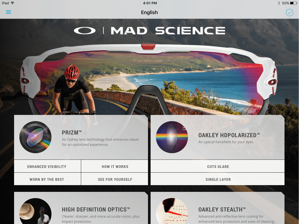 The Mad Science app is used to empower sales reps to better tell Oakley technology stories, and train sales associates. With over 1000 design patents, Oakley is the leading design brand rooted in sport performance. Gain the knowledge of Oakley’s Mad Scientists and install the app now!
