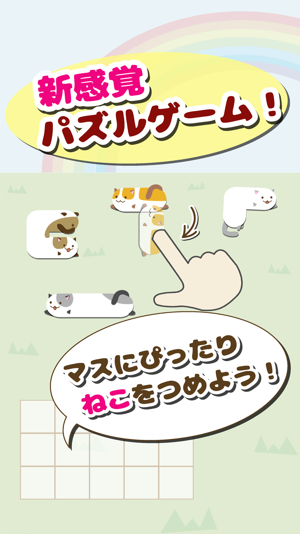 1)ねこをタップしたまま動かすと、ねこが移動します。