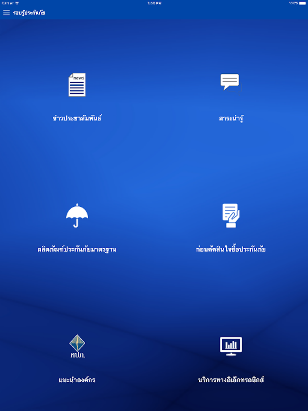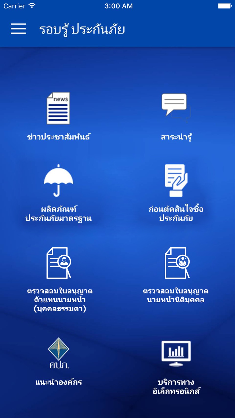 Application เพื่อการประกันภัย ให้ความรู้และข้อมูลข่าวสารเกี่ยวกับการประกันภัย บริการทางอิเล็กทรอนิกส์ คลินิกประกันภัยเพื่อการทำประกันที่เหมาะกับคุณ ค้นหากฎหมายประกันภัย ค้นหาที่อยู่บริษัทประกันภัย แนะนำและทำความรู้จักสำนักงาน คปภ. ร่วมกิจกรรมกับสำนักงาน คปภ. ผ่านทาง Application