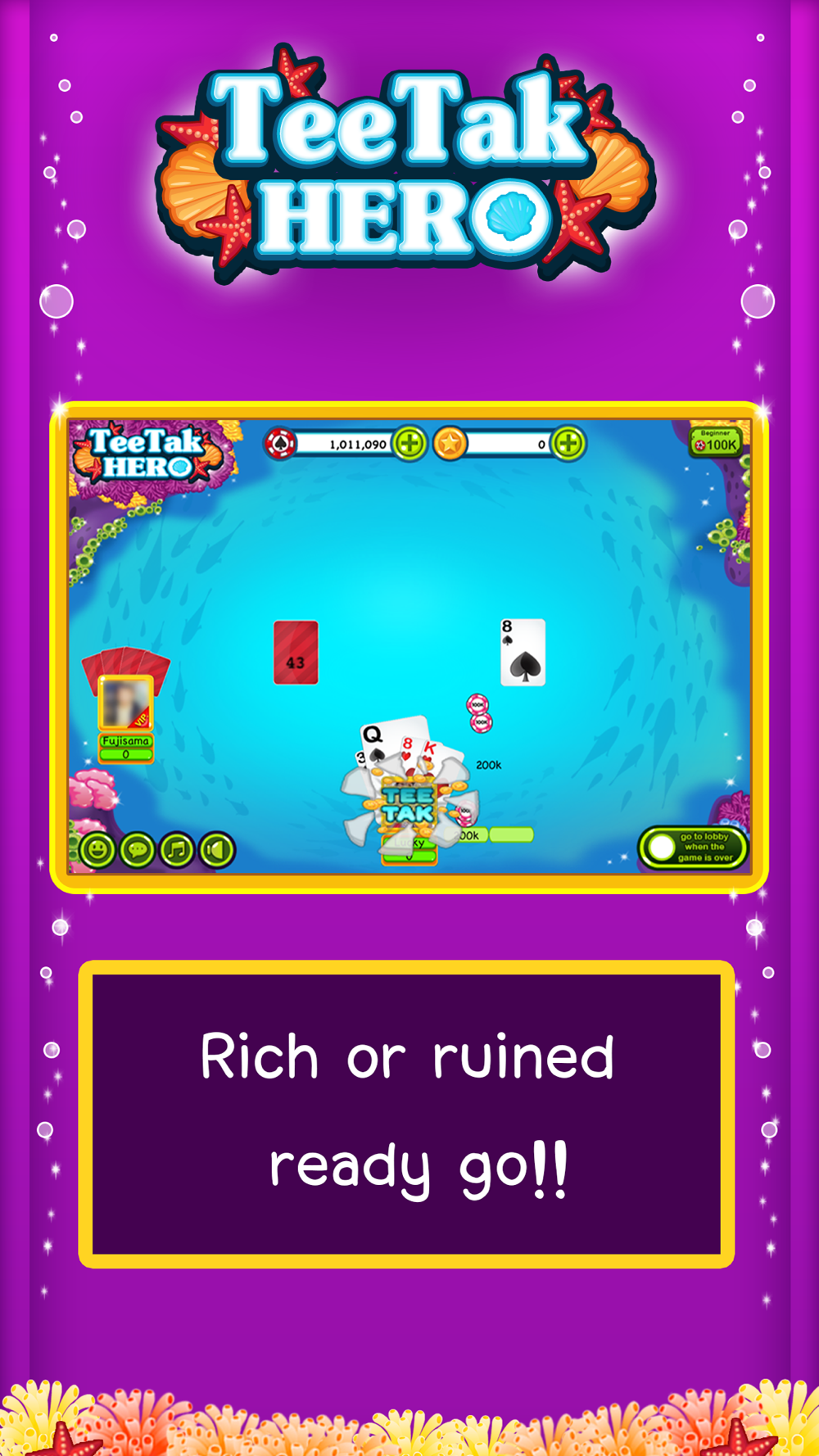 TeeTak Hero card game online in a brain training, you can join other players to play and send emoticon message during playback fun. Just enjoy your 4 cards with 1 card from midfield. Check your cards with midfield. The cards are not the same, you lose. But if the same and the more points you win. If you're sure to win, Select TeeTak and wait for a chance to win all of the money from midfield.