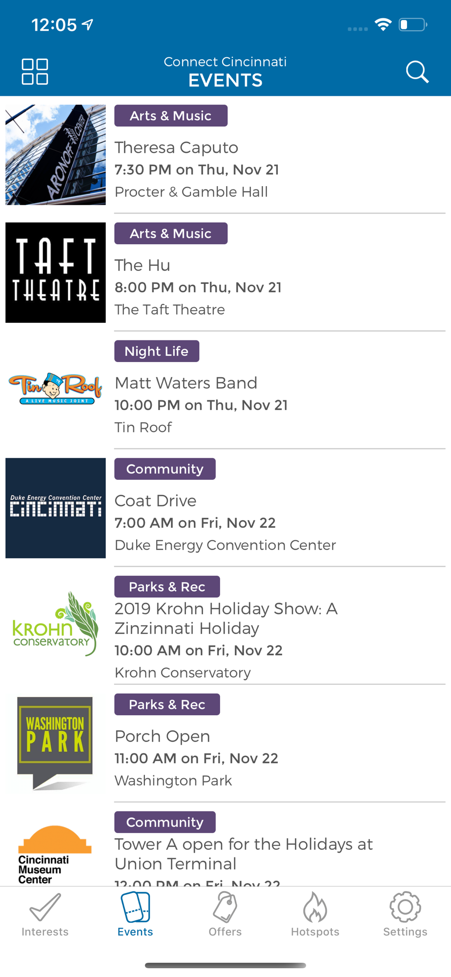 • Events: Ban Boredom with Connect Cincinnati. Be the first to discover upcoming events and things to do in every part of the city. If you choose, you can also be alerted to cool events nearby as you travel around the area.