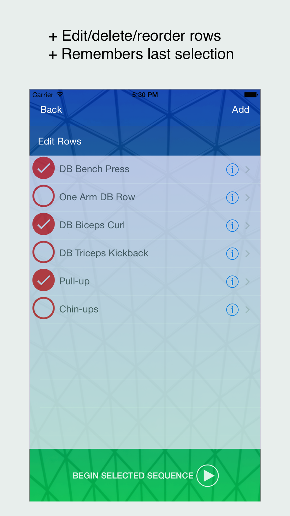 + Easily add your exercises by muscle group for easy access (Core, Upper, or Lower body).