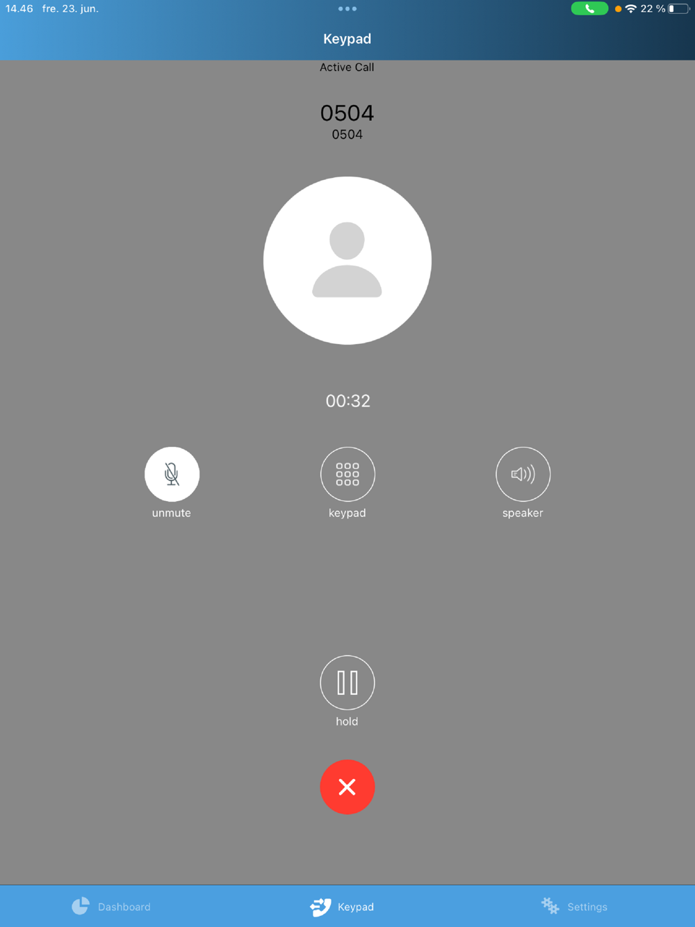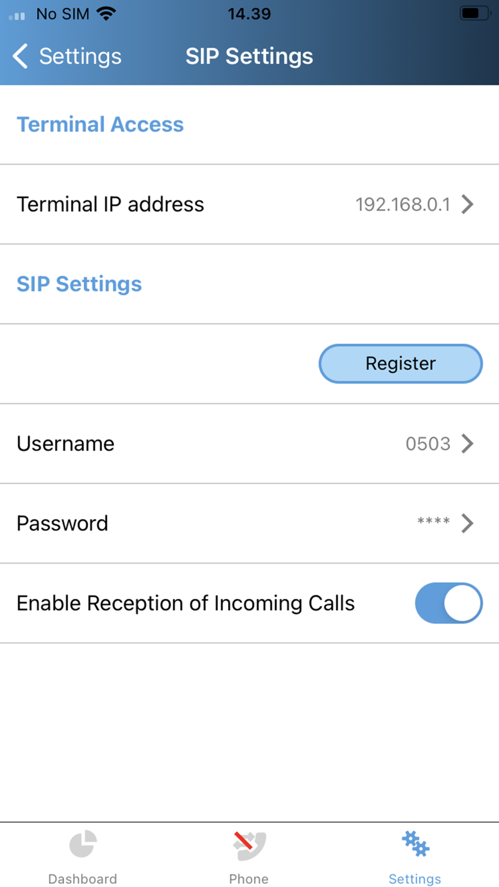 - Settings - extended menu with access to phone settings (SIP), terminal pointing assistance, terminal webpage, and About page.