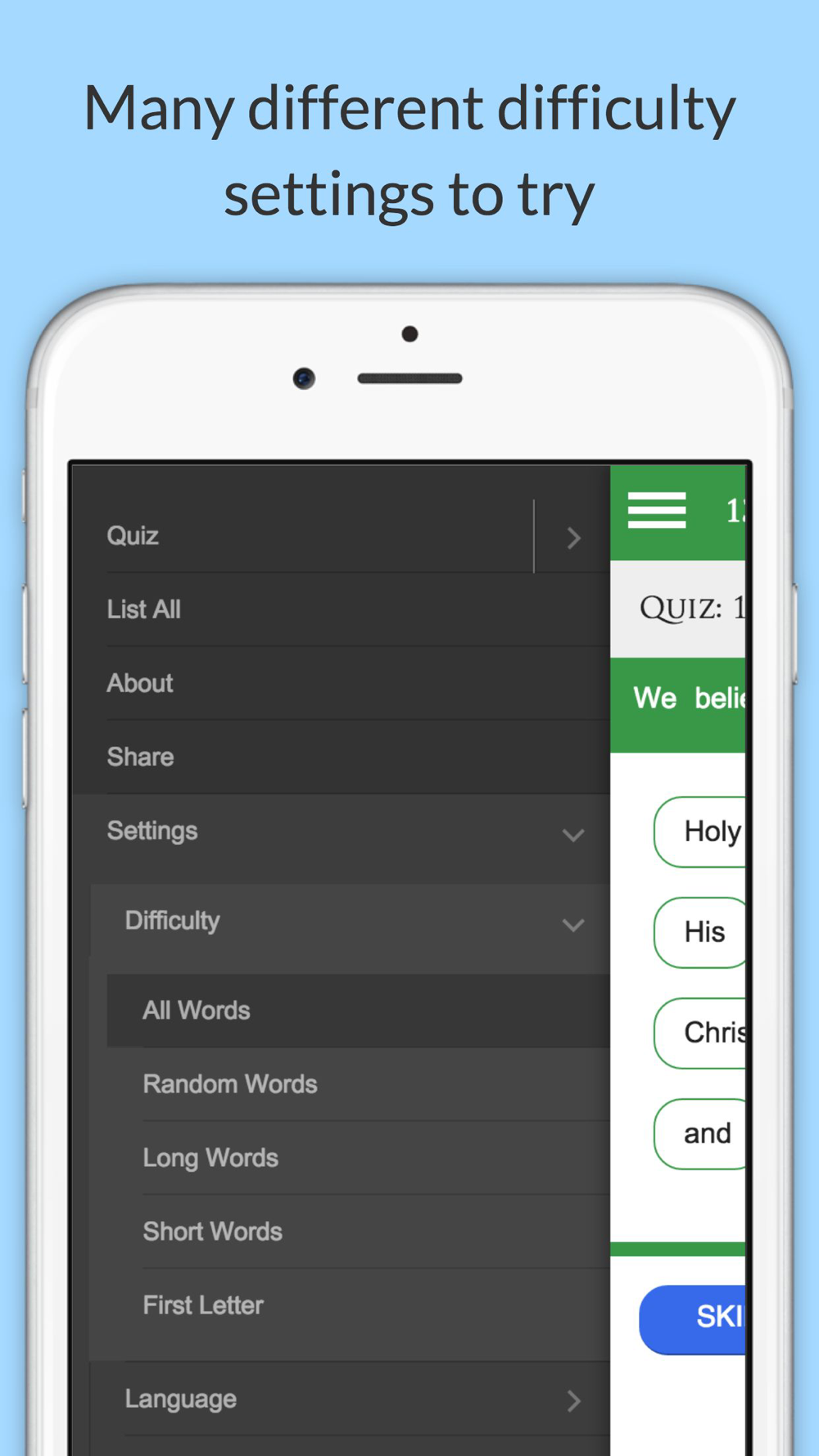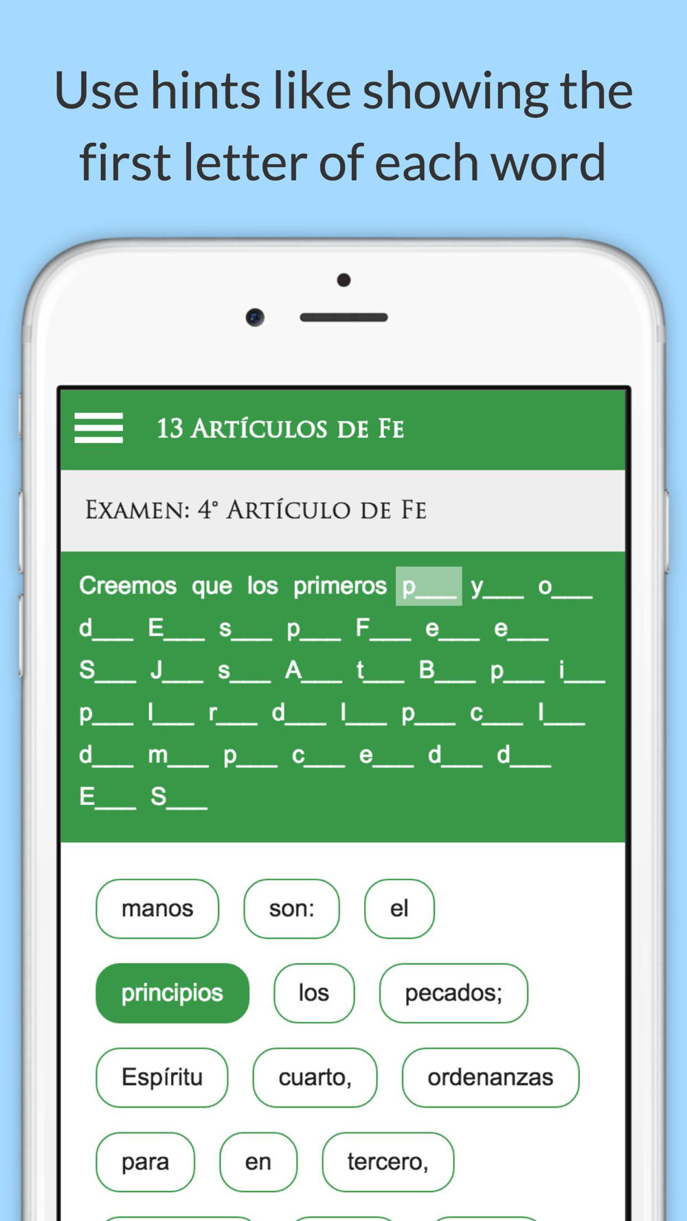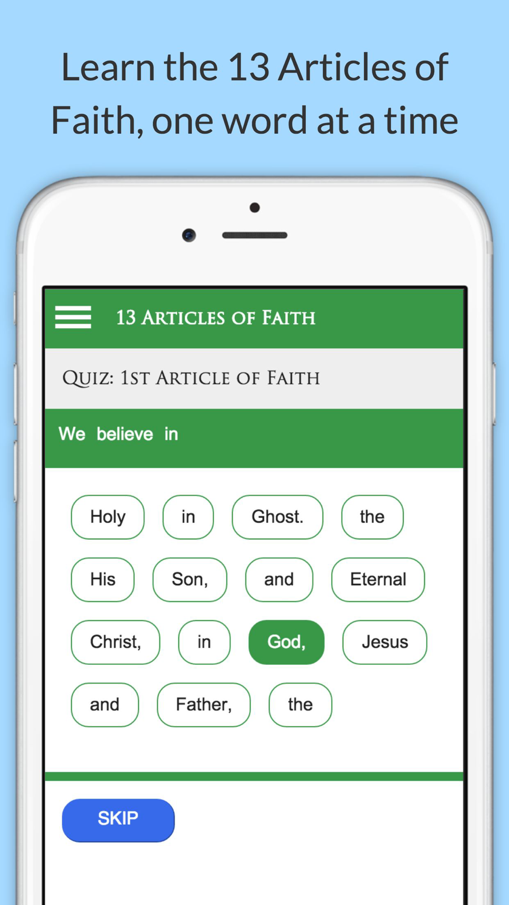 An easy to use tool to view, learn or memorize or rememorize all 13 Articles of Faith of the Church of Jesus Christ of Latter-Day Saints. Review the Mormon articles of faith in a clean list, and quiz yourself on each of them in multiple ways. The quiz presents the words from each article of faith in a scrambled order, you just tap the words in the correct order. Many different levels: all words scrambled, a random set of half the words scrambled, only long words or short words scrambled, all words with a first letter displayed as a hint... etc. Suggest more levels if you can think of them. This is a great Sunday app for primary kids, youth and adults.