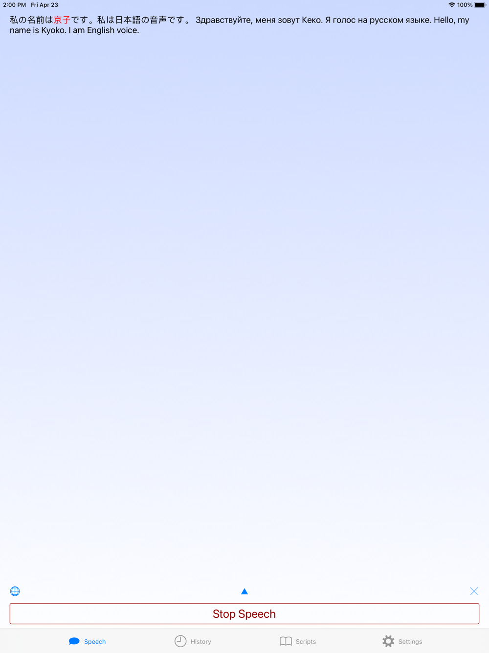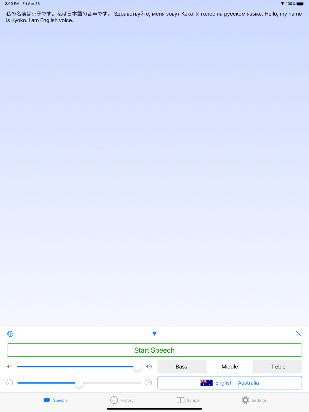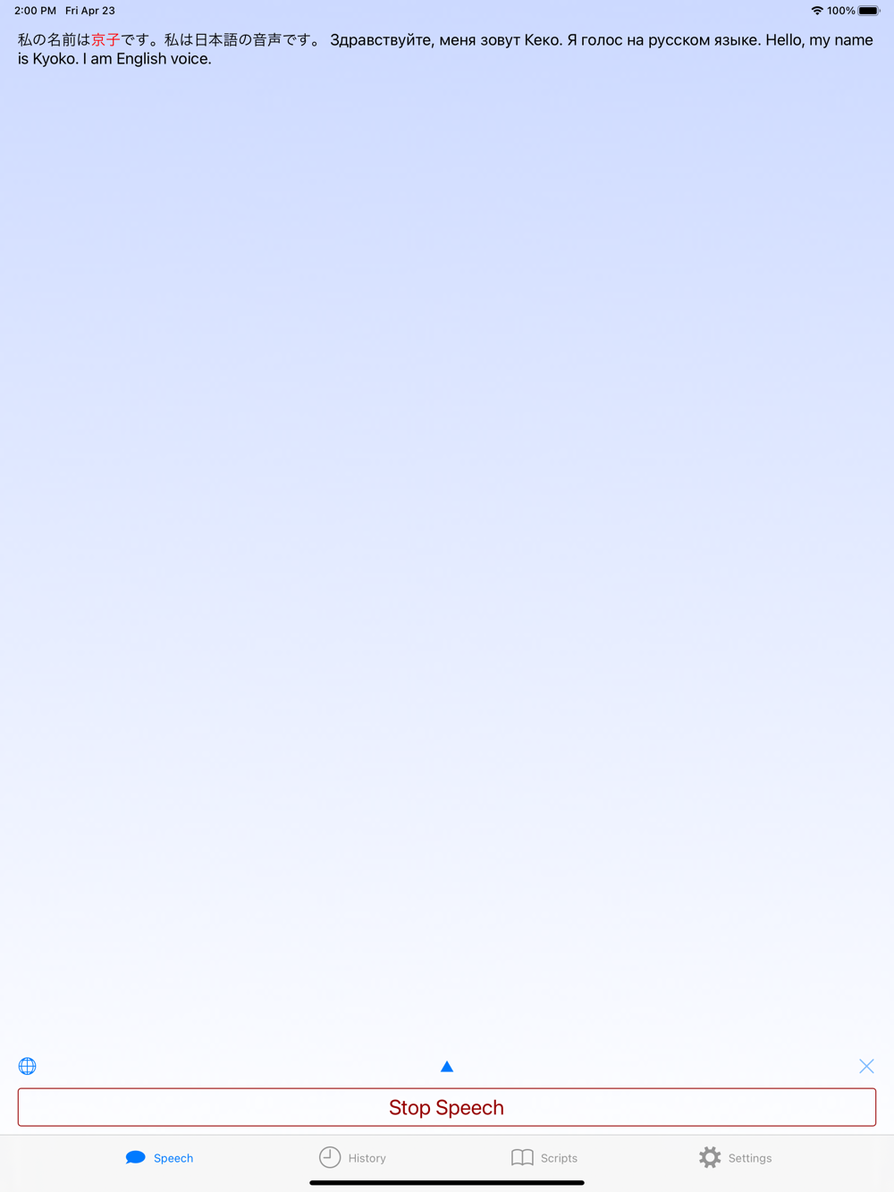 This app acts as a spokesperson for you. The app will read an input text in multilingual or in monolingual. If you want to check how to read sentences and words in an optional language, the app is most suitable. The app uses the speech synthesizer in iOS default, therefore it is not required a network connection.