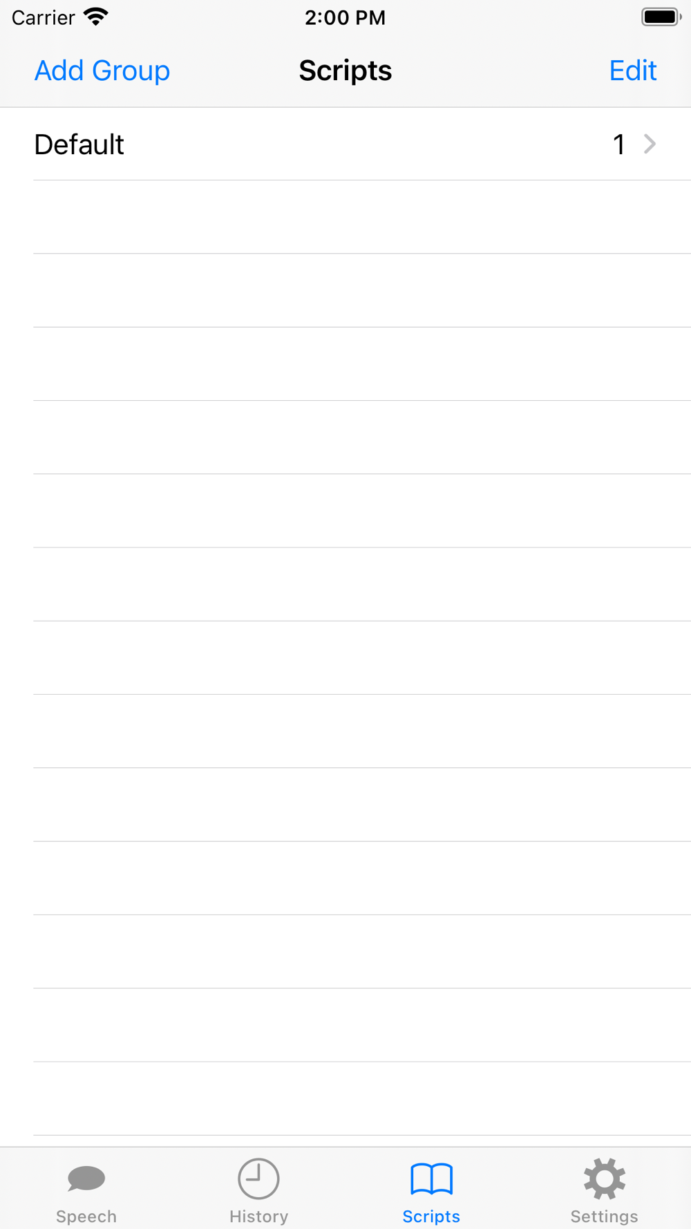 The scripts screen can group speech texts, but registration is from the history screen or a URL scheme. If you tap a plus button, you can create a new group.