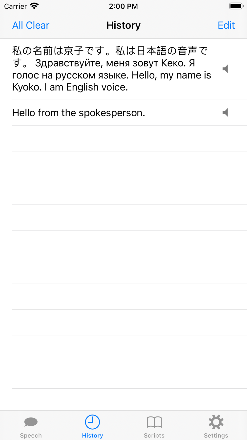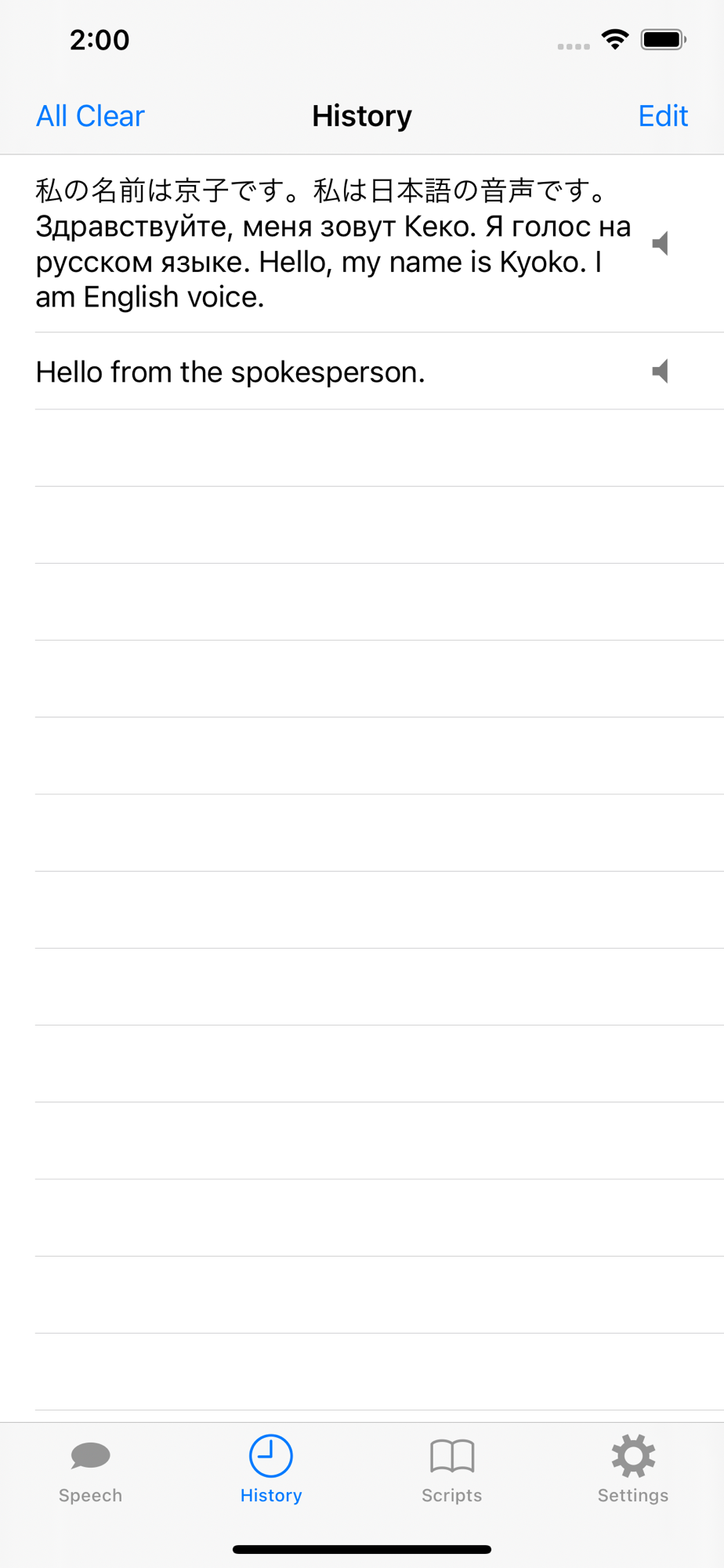 A speech text will be recorded on the history screen. If you tap a text, the engine begins to read a selected text. Tap again, the engine cancels reading. Moreover, an edit button can register a selected text to the scripts screen and inputs the text into the speech screen.