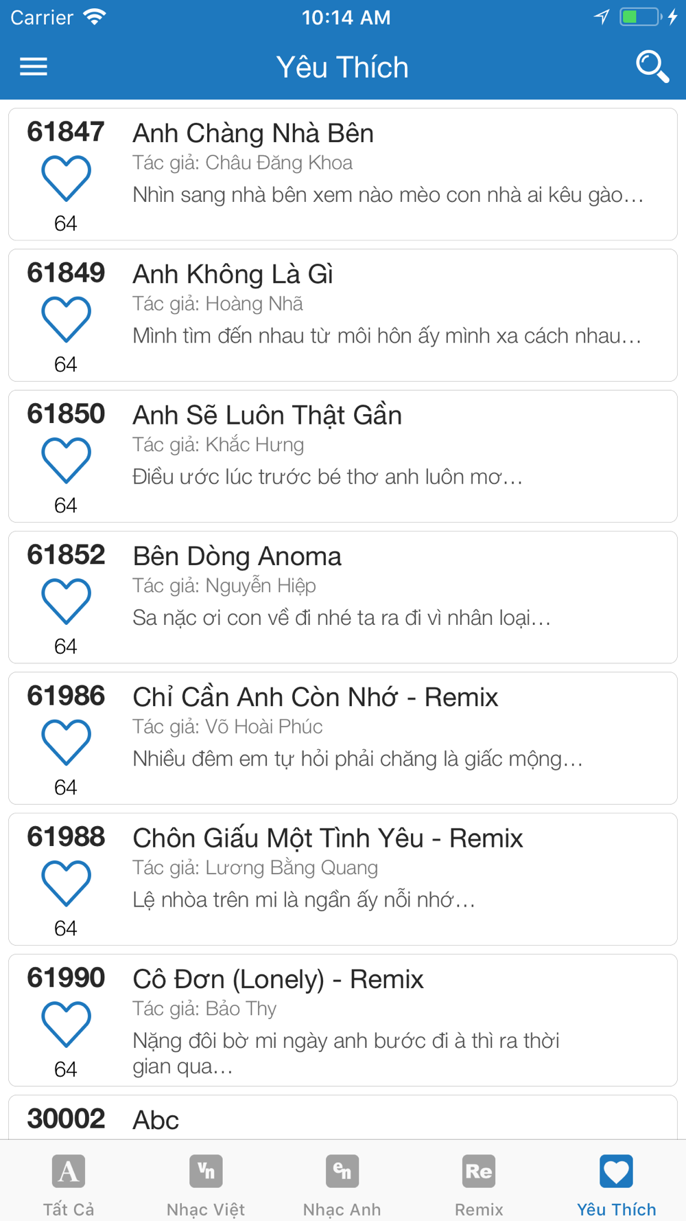 » Hiển thị tất cả bài hát theo danh sách 5 số, 6 số, Tiếng Việt và Tiếng Anh.