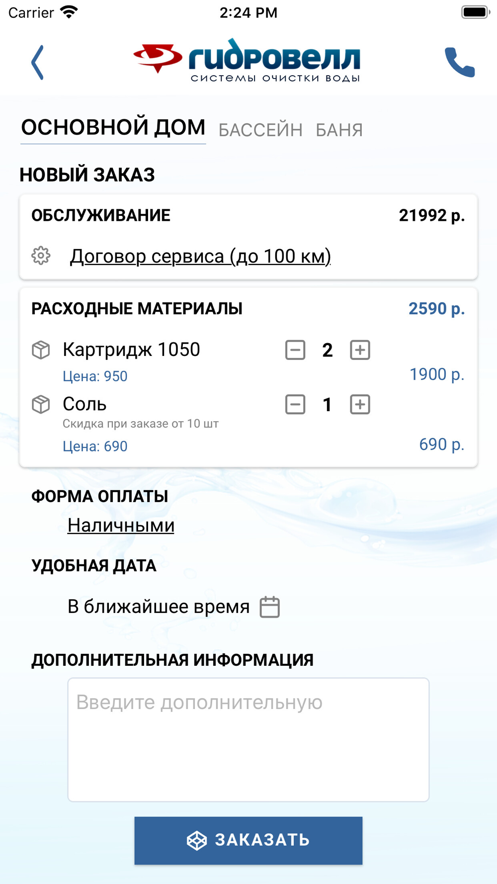 Приложение предназначено для клиентов компании “Гидровелл”. С помощью приложения можно вызвать специалиста, заказать расходные материалы, заказать сервисное обслуживание, купить систему очистки воды.