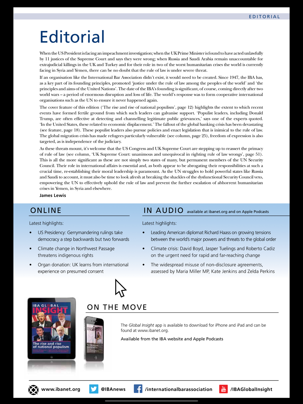IBA Global Insight is the flagship publication of the International Bar Association (IBA), the membership organisation for the world-wide legal profession. Published six times a year, distributed to all members of the IBA, and available online, IBA Global Insight features in-depth articles by accomplished journalists, covering major developments in international legal, business and human rights issues, and interviews with the leading authorities in these areas. IBA Global Insight also publishes regular comment articles from its columnists around the world.