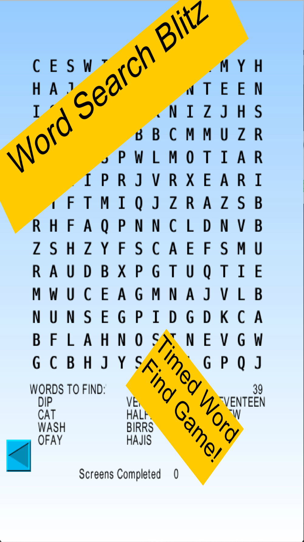 Word Search Blitz has a large 30,000+ word database that each puzzle randomly select the players word list for each game. Creating the possibility of millions of different puzzles. This lightening fast game give the play 60 seconds to find 12 terms. As the player find a word the game rewards the player with an extra 5 seconds. This is not your grandma's word search, it is hard, fast paced and very challenging.