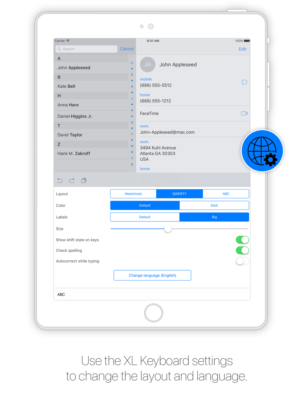 Designed to resemble the standard keyboard with extra large keys. Change the size of the keyboard, select any existing system language for spelling suggestions and autocorrect and choose the keyboard layout you like.