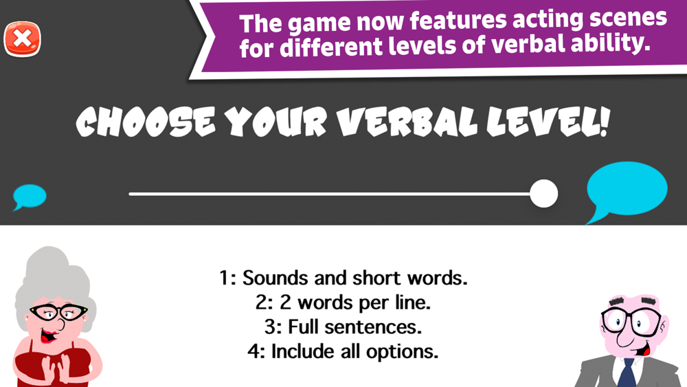 This game operates as a safe and fun way for kids to practice their social communication skills through modules that require listening, watching, acting, speaking and singing. Levels are tailored to verbal ability, from sounds and short words to full sentences. A great resource for coaching nonverbal aspects of expression and emotion understanding. Also a great resource for encouraging speech in kids, and English language learning. Start with roaring along in the Dinosaur song, work up to using small phrases, and then move on to full sentences! Or, start with full sentences on verbal level 3, and act out emotions with increasing complexity.