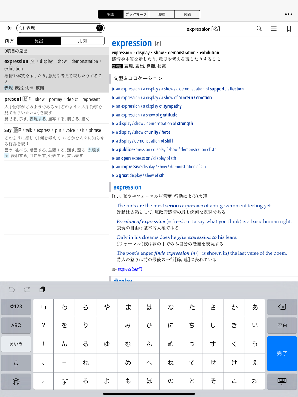 物書堂の他の辞書アプリと同様に、「なぞってジャンプ®」や日本語での用例検索など便利な機能を搭載しています。またブックマークや履歴機能など辞典アプリの基本的な機能も充実しています。
