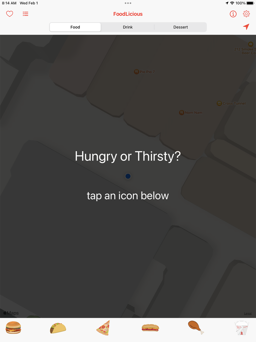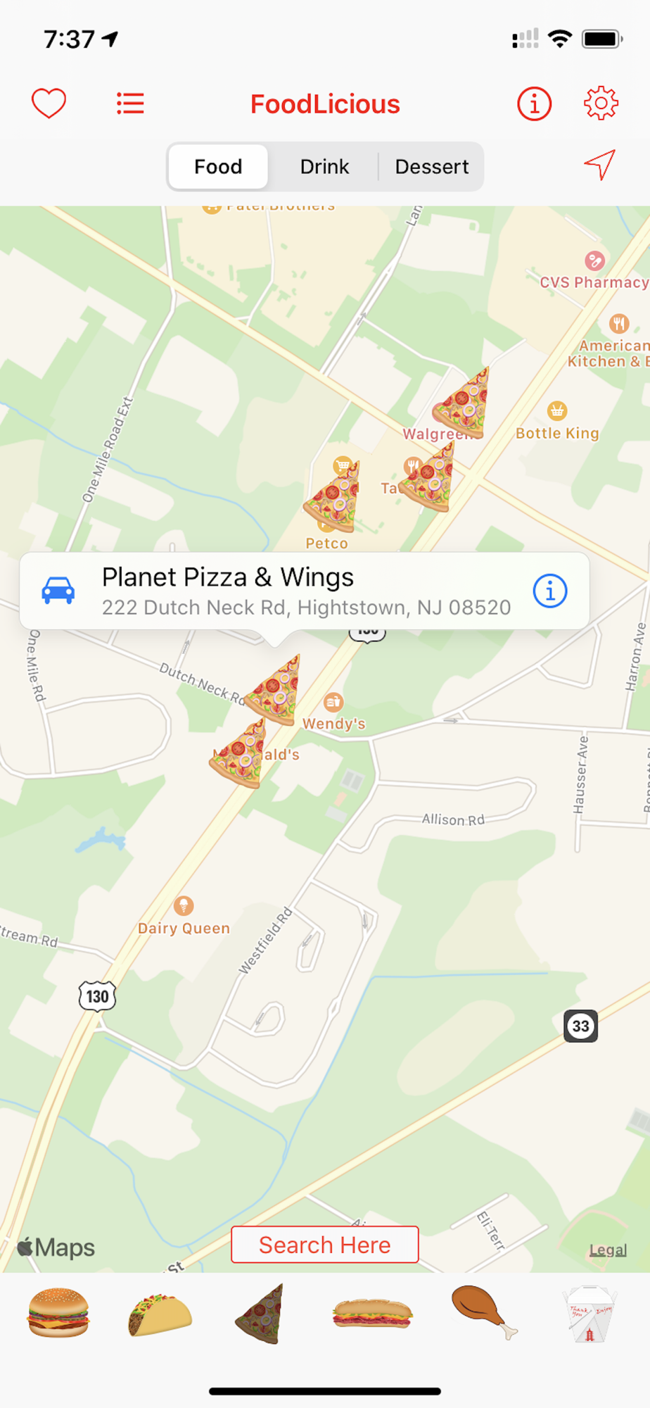 Select any food, drink or dessert and Foodlicious will locate these items and display them on an interactive map around your location. Tap any result to get full details.