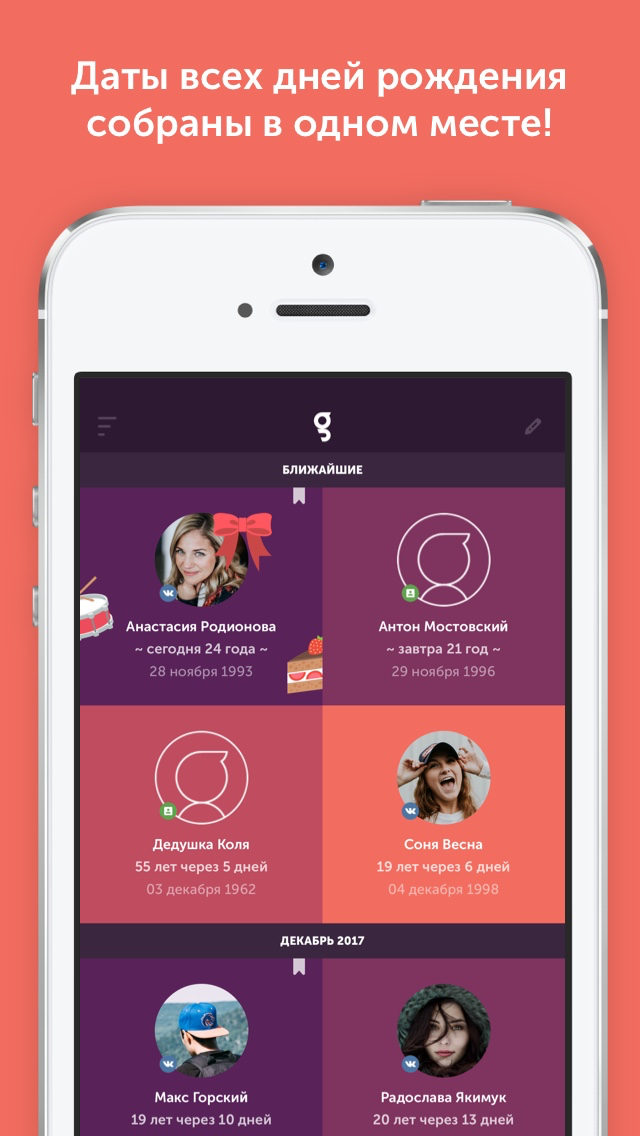 Удобный интерфейс и система уведомлений, благодаря которым ты всегда будешь готов поздравить своих друзей и близких! Так же доступна синхронизация с Адресной книгой и ВКонтакте!