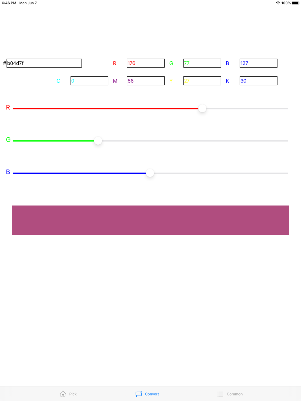This application is a color tool application. Its main functions include color extraction, which fully implements the color picker function on the PS. The user can extract the desired color, supports RGB, hexadecimal values, and CMYK, and colors between the three Conversion function, and a list of commonly used colors classified.