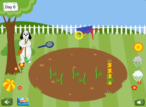 The activity starts with Smudge planting some sunflower seeds in the brown patch of earth. Children select one of the types of weather from the right of the screen for each day. To do this, children tap on one of the weather symbols, and drag it to the sky before letting it go. The day is then completed, and they will see how the seeds have grown with that weather choice.