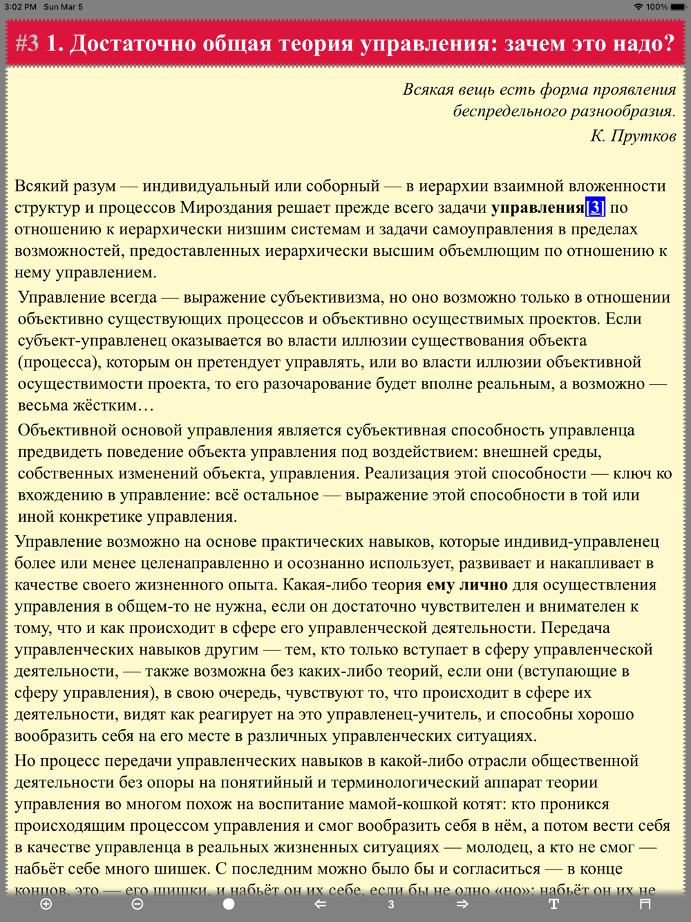 В приложении удобное управление и меню. Есть возможность выбрать фон: белый, черный и желтый, изменить размер шрифта, вид шрифта, а также перелистывать рубрики. Можно включить вывод полосы с названием рубрики вверху. Кроме того, запоминается последнее место чтения при закрытии приложения. Можно открыть приложение и продолжить чтение.