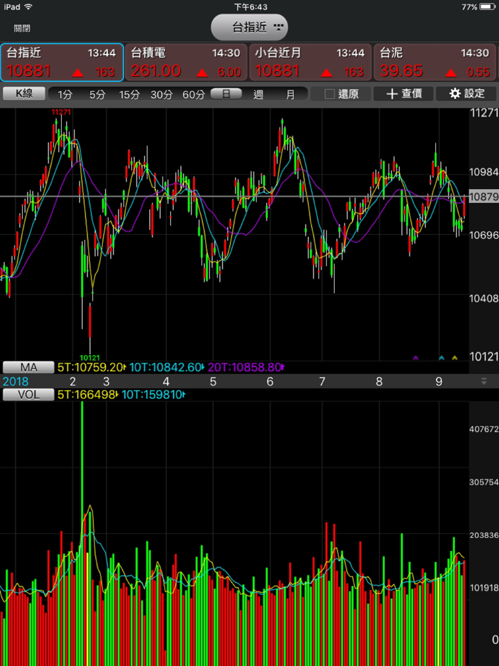 -技術線圖:支援5分鐘,60分鐘,日,週,月線圖,可觸控指標切換成交量,RSI,KD,MACD PSY等技術指標,並切換橫置顯示。