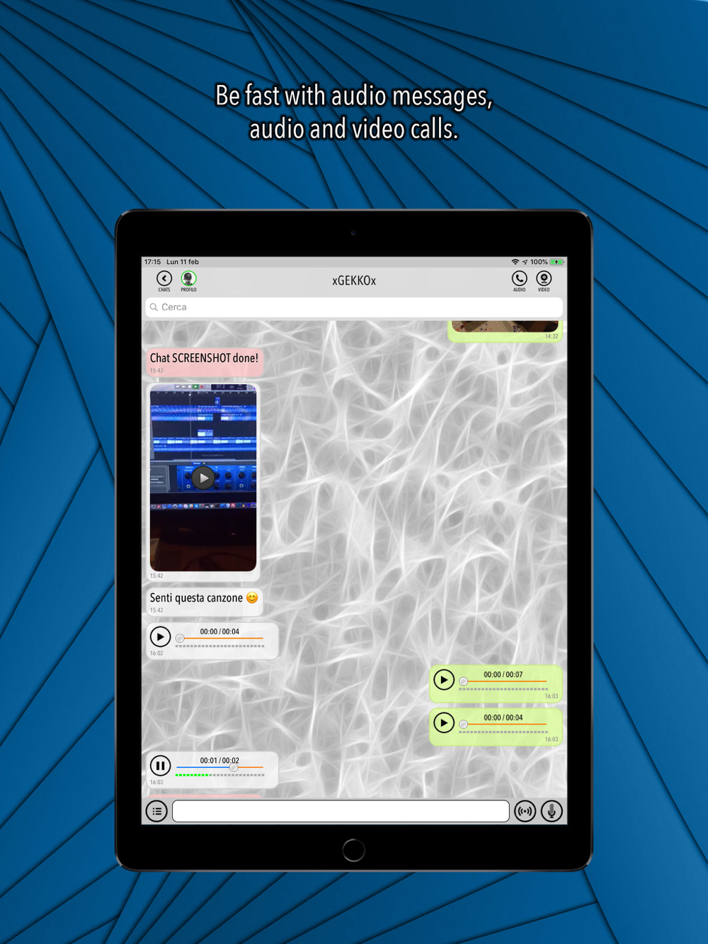 Welcome to GEKKO Messenger. The best and entertaining messenger you can find on the store. HOW TO USE : Create a new account simply choosing a login and a password. That's all. When you have an account you can login, add friends (if they given you their login o a nick) and start to chat. You can choose if share your profile infos or make it private. Conversations never been so easy before. FEATURES : - Find new friends without contact access - Single Chats - Private chat with PIN - Audio messages - Voice calls - Video calls - Send photos, videos, documents and audio - Voice assistance - Block / Unblock contact - Nudge 1 time a minute - Theme changer - Plugins where to edit photo, listen music and much more PLUGINS : - Radio - Perfect Zero (Game) - Friends radar - Photo Editor - Screenshot Notifier HELP : Create a new chat searching for helper. If you have feedback, questions, or concerns, please email us at: