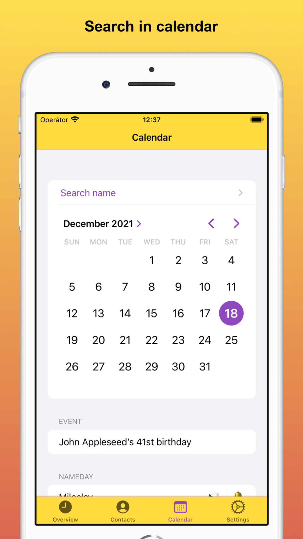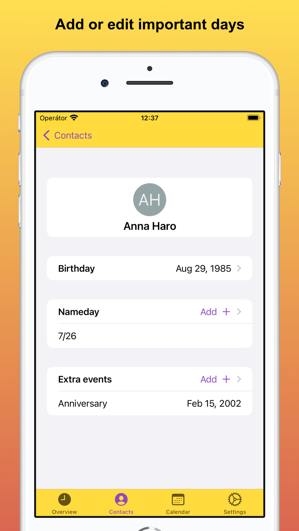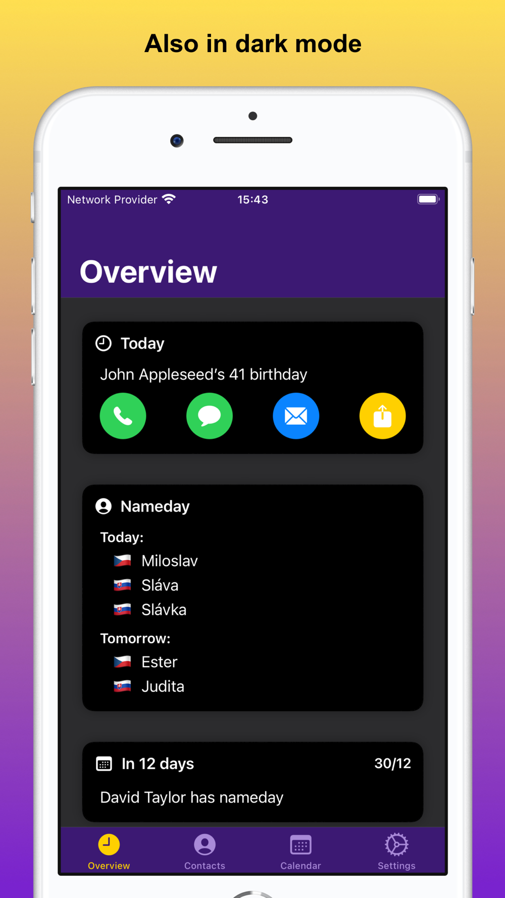 iDays will notify you, which of your contacts is celebrating birthday, nameday or other important day. Time of the notification can be set. You may then call or write message to the celebrating contacts.