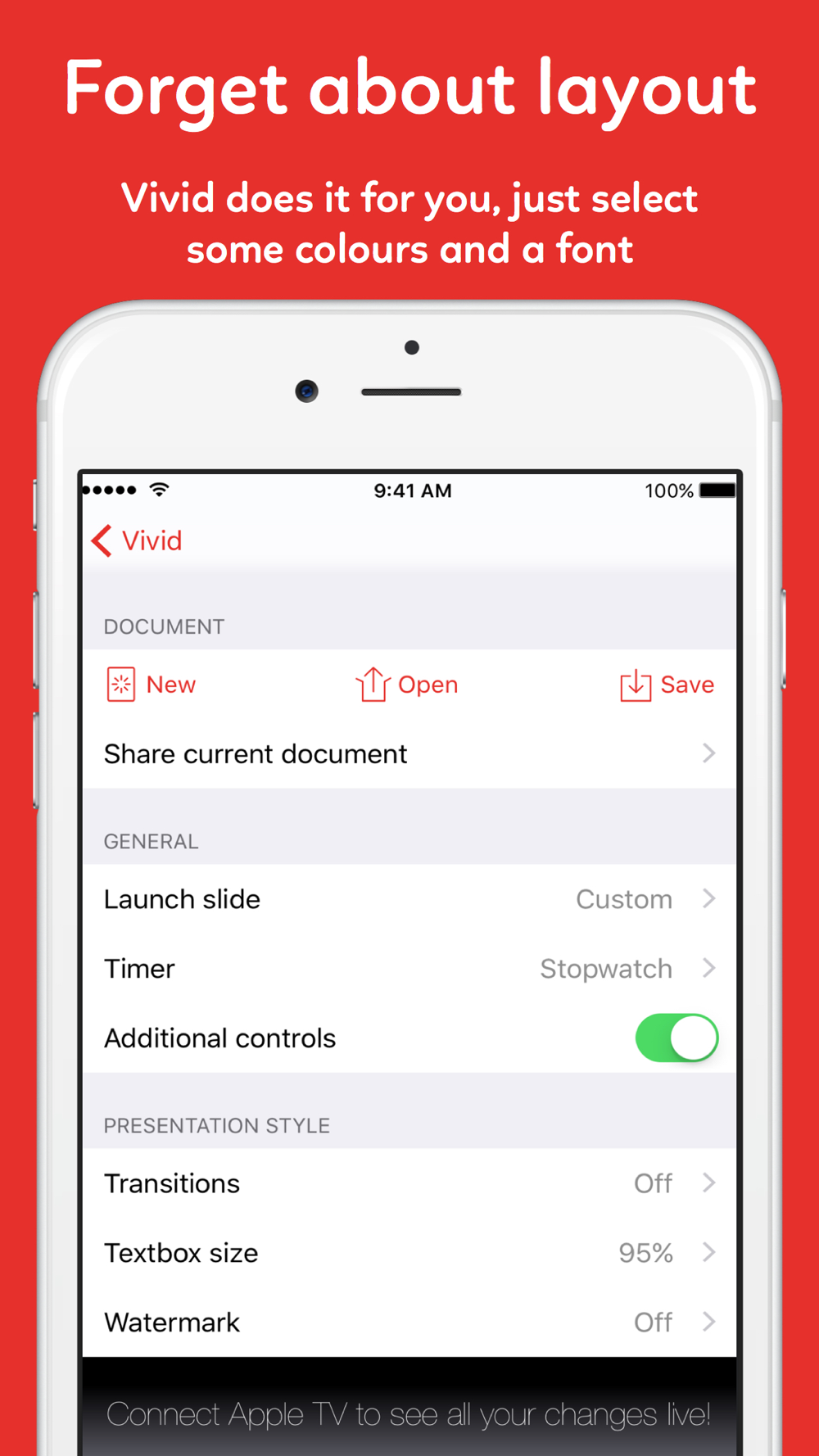 Vivid is a new approach to making presentations. We take care of the layout for you – allowing you to concentrate on more important things. Simply get some structure into your talk and create your key messages with Vivid, wherever you are. Then present it all from your mobile using AirPlay.
