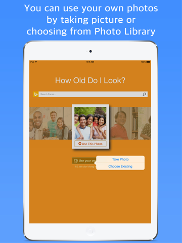 This app guesses a person's age and gender based on a photo of their face. You can choose photos by search people name, or you can take photo from camera or choose from Photo Library.