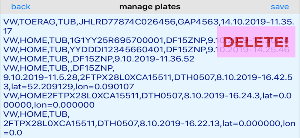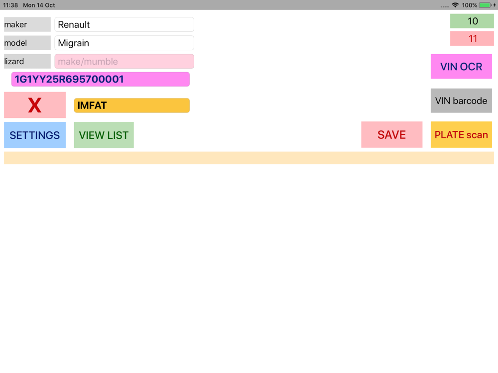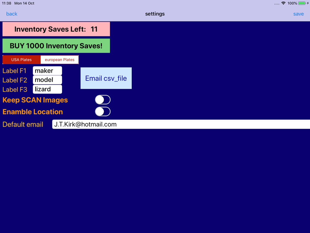 The app can store these numbers in a CSV file that you can copy and edit via iTunes FileSharing and you can export it via email so you can import it into your stock control system. You can set the App to keep images of the car numberplate and VIN number that the App OCRs. These are available via iTunes FifleSharing.
