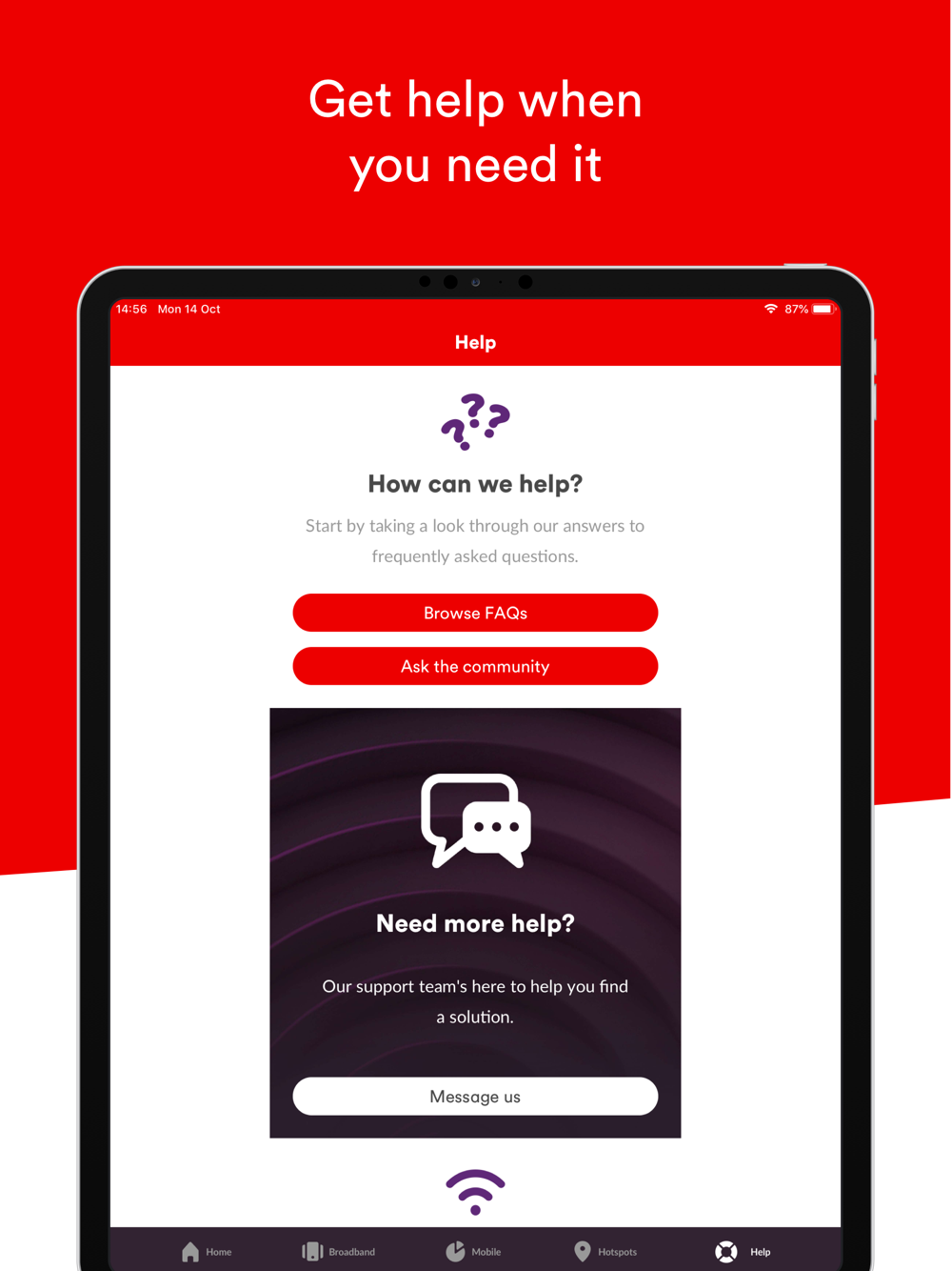 It’s our new-and-improved two-step speed test powered by SamKnows. First, it guides you around your home, room by room, to check WiFi performance in each one. Then, it tests your broadband speed to make sure there are no network issues. Just connect to the Hub, tap ‘Start the scan’ then let the app take you through the rest. If the scan finds any areas without Superstrong WiFi, we’ll suggest ways to improve it – with our WiFi Pods*, for example. Sorted!