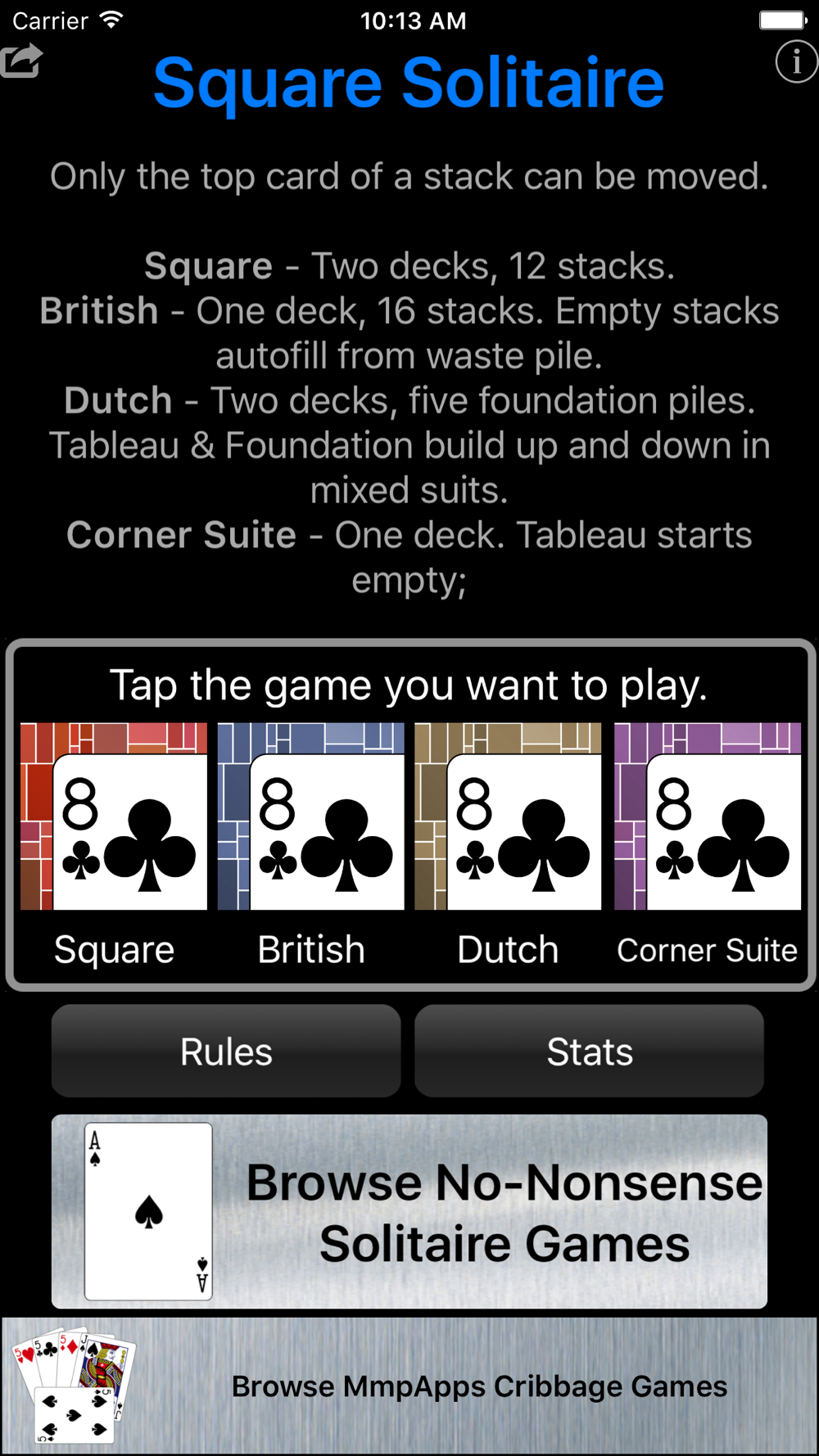 Four oddball games of solitaire. Free to play. No in-app purchases.