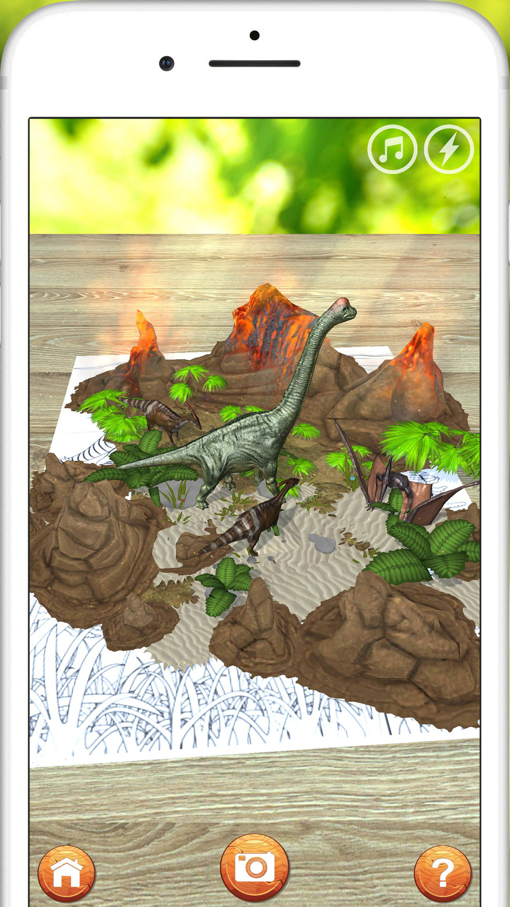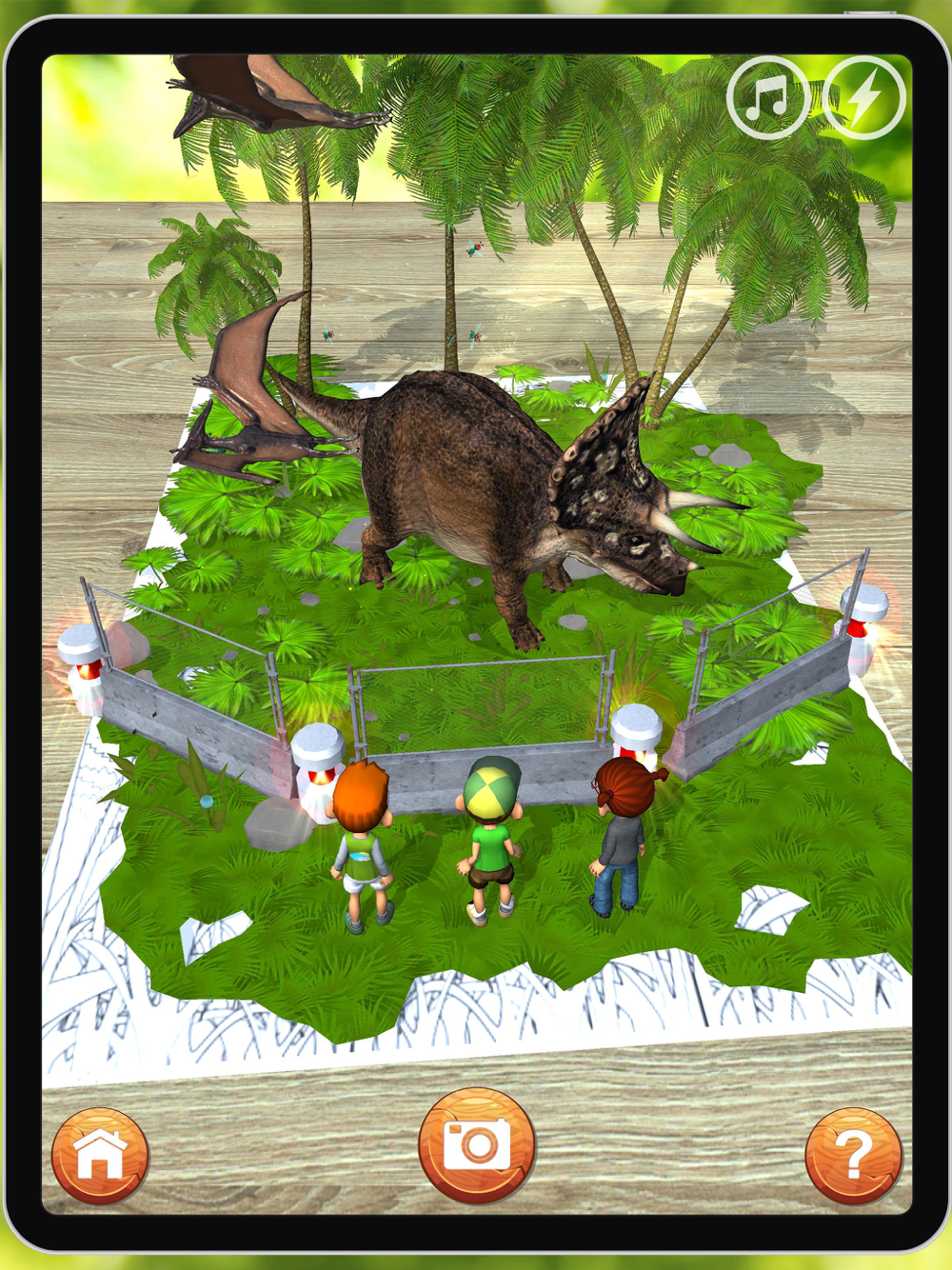 When running the app, point your smartphone’s camera at the page of the book to see what these awesome creations look like. Dinosaurs make sounds and move. You can control them by using the menu or by touching them. You can take lots of interesting photos with any of the characters and share them on social networks.