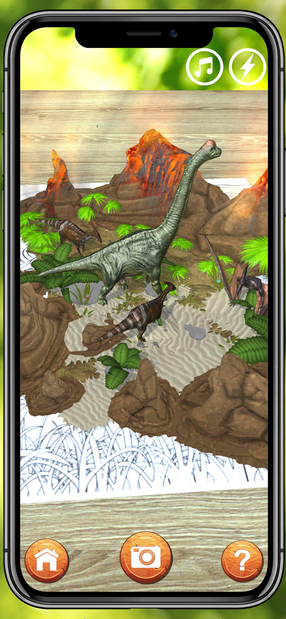To animate the dinosaur, point your smartphone camera at the page and wait until the character appears. By touching the dinosaur on the smartphone’s screen, you can see its reaction and hear the sounds it makes. Also, to control the animations you can use the buttons of the menu on the right.