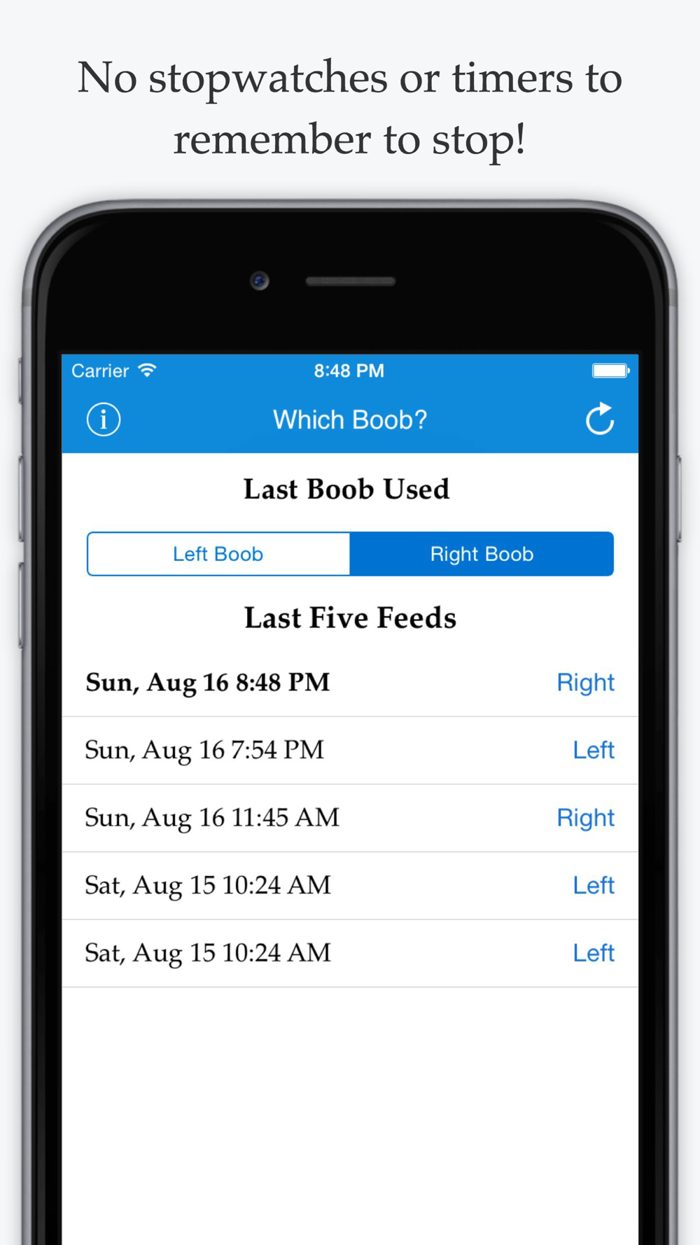 Which Boob? is a simple nursing app designed to remember the time of the last feed and the breast used. There are no timers or stopwatches to remember to stop. Simply press the "Left Boob" or "Right Boob" button and that's it! The today extension makes the app especially easy and quick to use during night feedings.