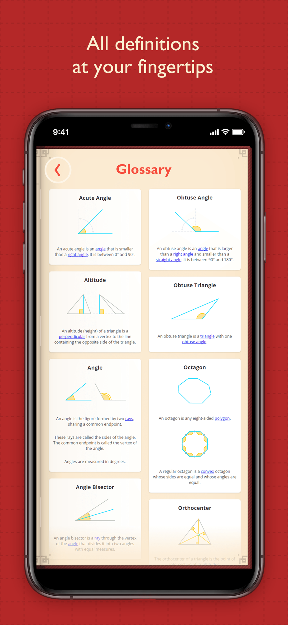 If you forgot a definition, you can instantly find it in the app’s glossary. To find the definition of any term that is used in conditions of a problem, just tap on the Info (“i”) button.
