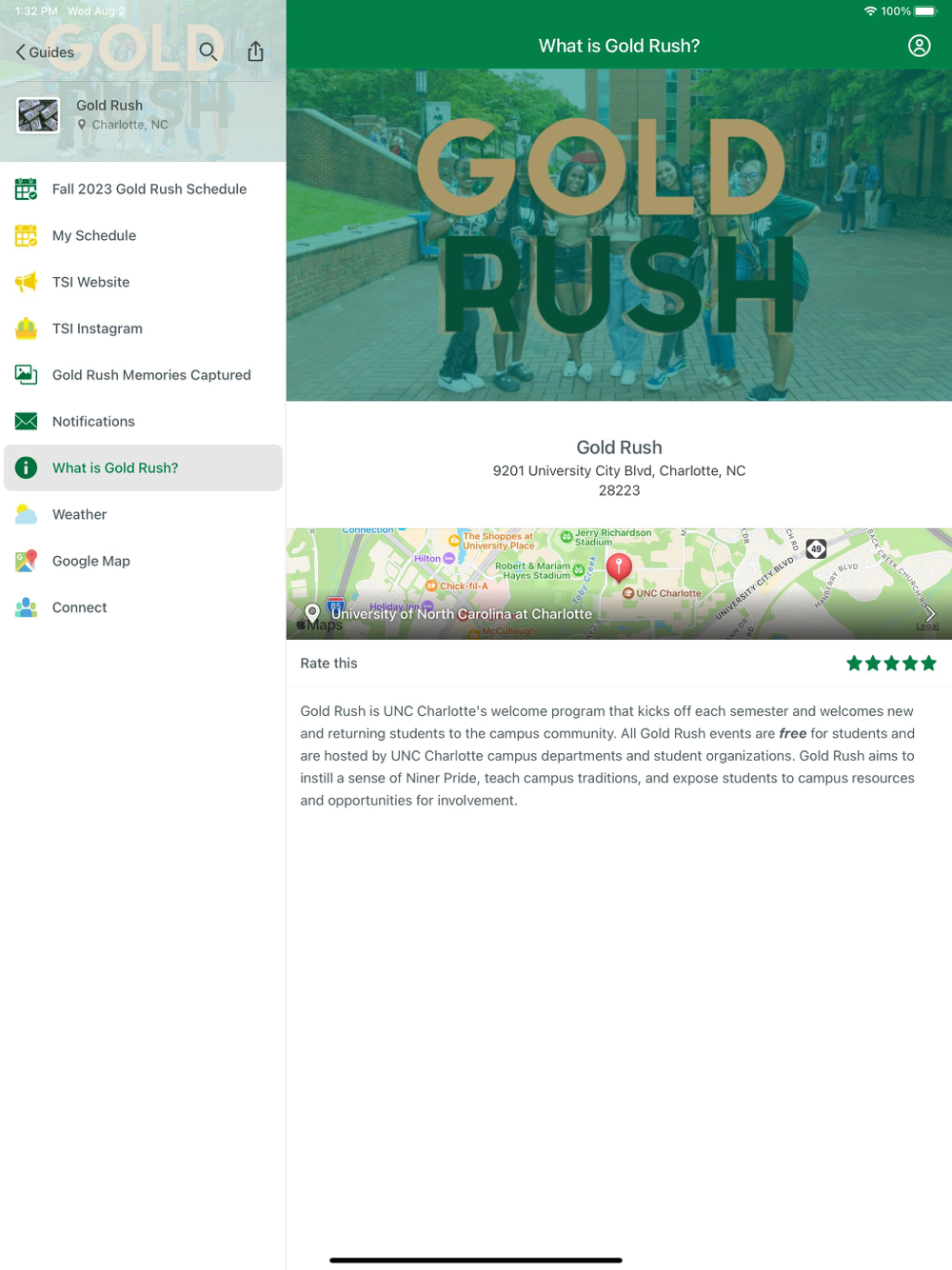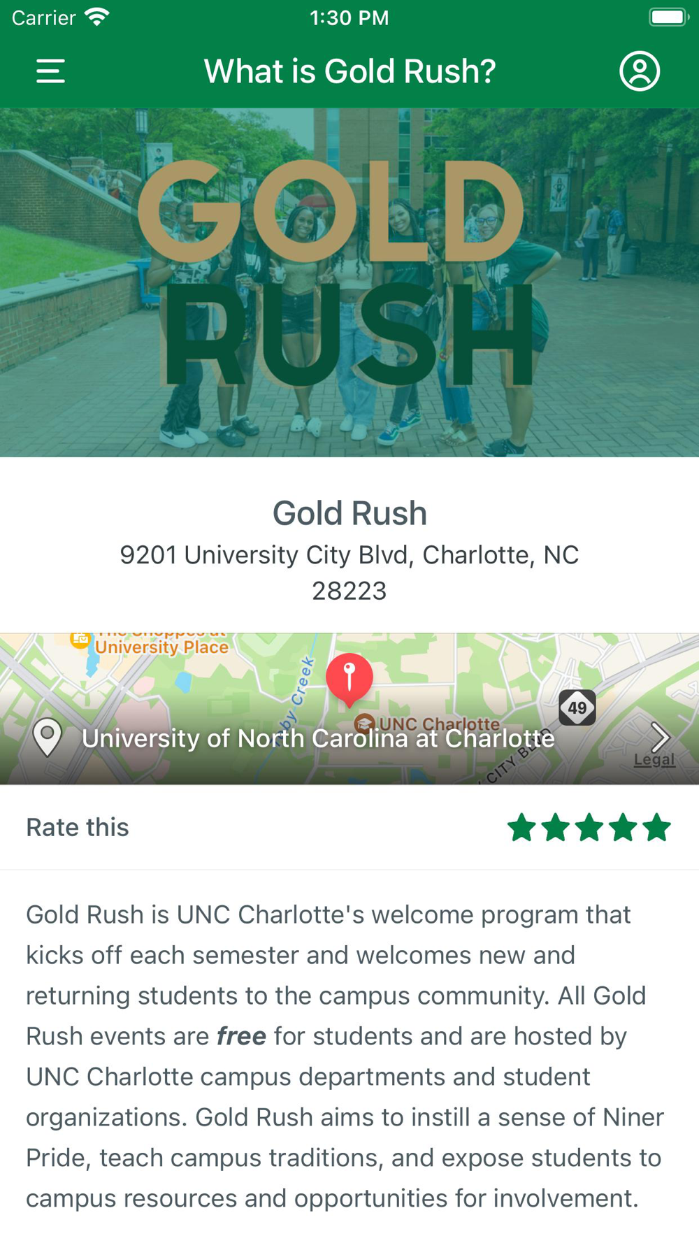 Niner DestiNation is the informational app for the University of North Carolina at Charlotte. The app includes guides for various events and programs including: SOAR, Week of Welcome, Family Weekend, and more!