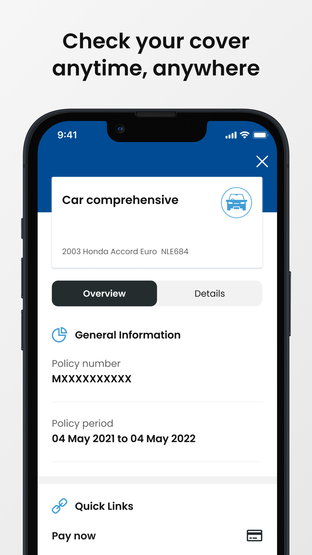 View your policy information and documents in the app. You can see what you’re covered for at any time. And choose to get your insurance documents by email or by post.