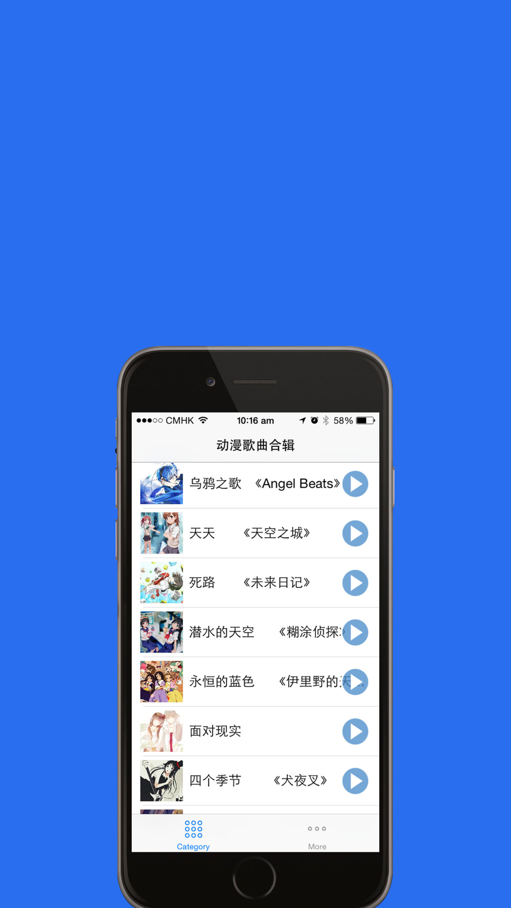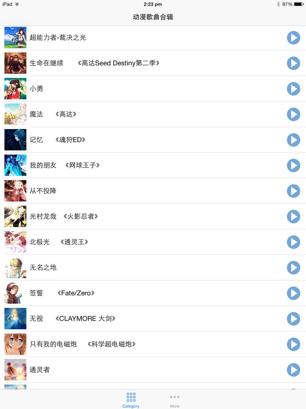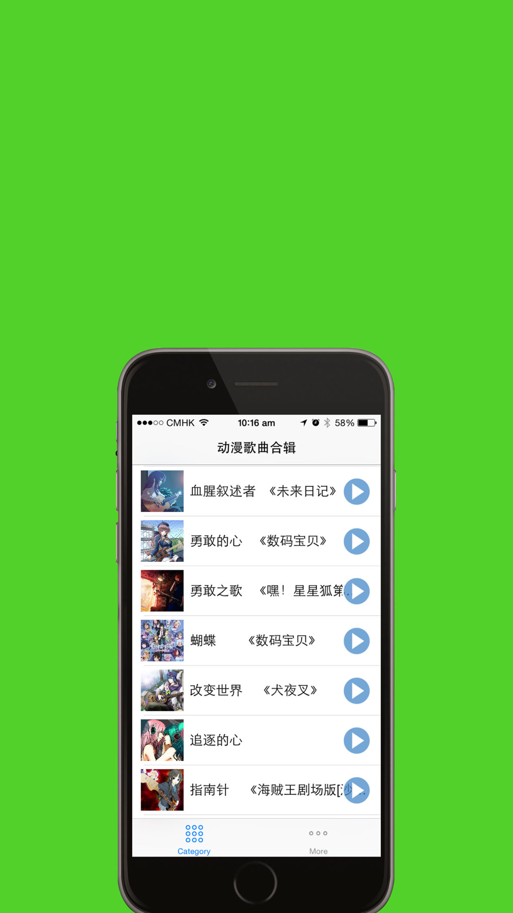 《动漫歌曲集锦》收集了日本经典高品质动漫音乐大全,绝对是动漫爱好者珍藏+精华欣赏动漫曲爱不释手的最佳软件! 由于软件体积较大, 请在wifi环境中下载安装, 一次下载, 后续无需再消耗网络流量!