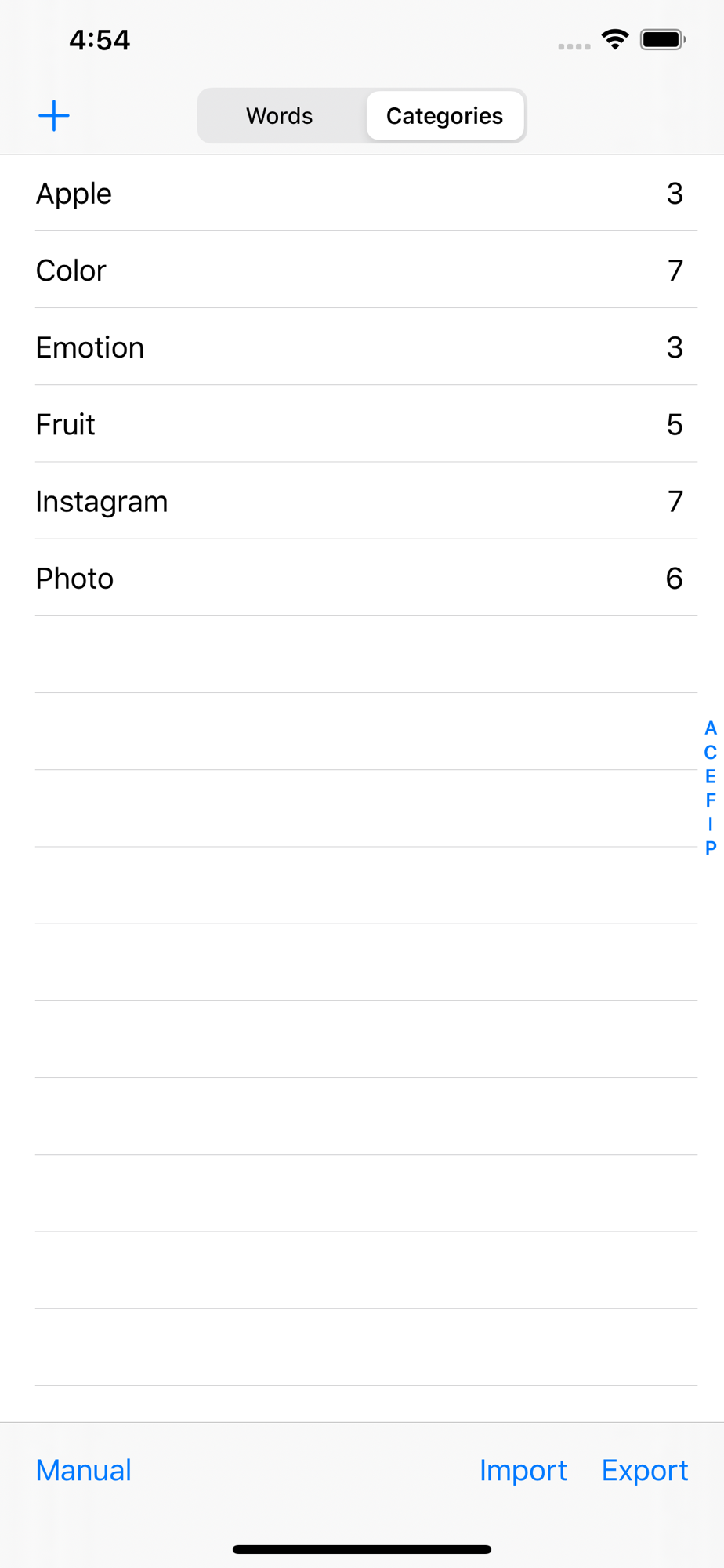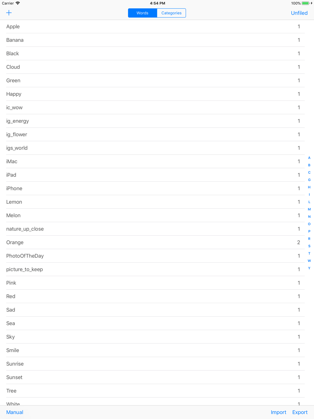 To add/modify/delete word or category, launch #Tag app. You can import categories and tags from text file stored in cloud storage services such iCloud, Dropbox and so on.
