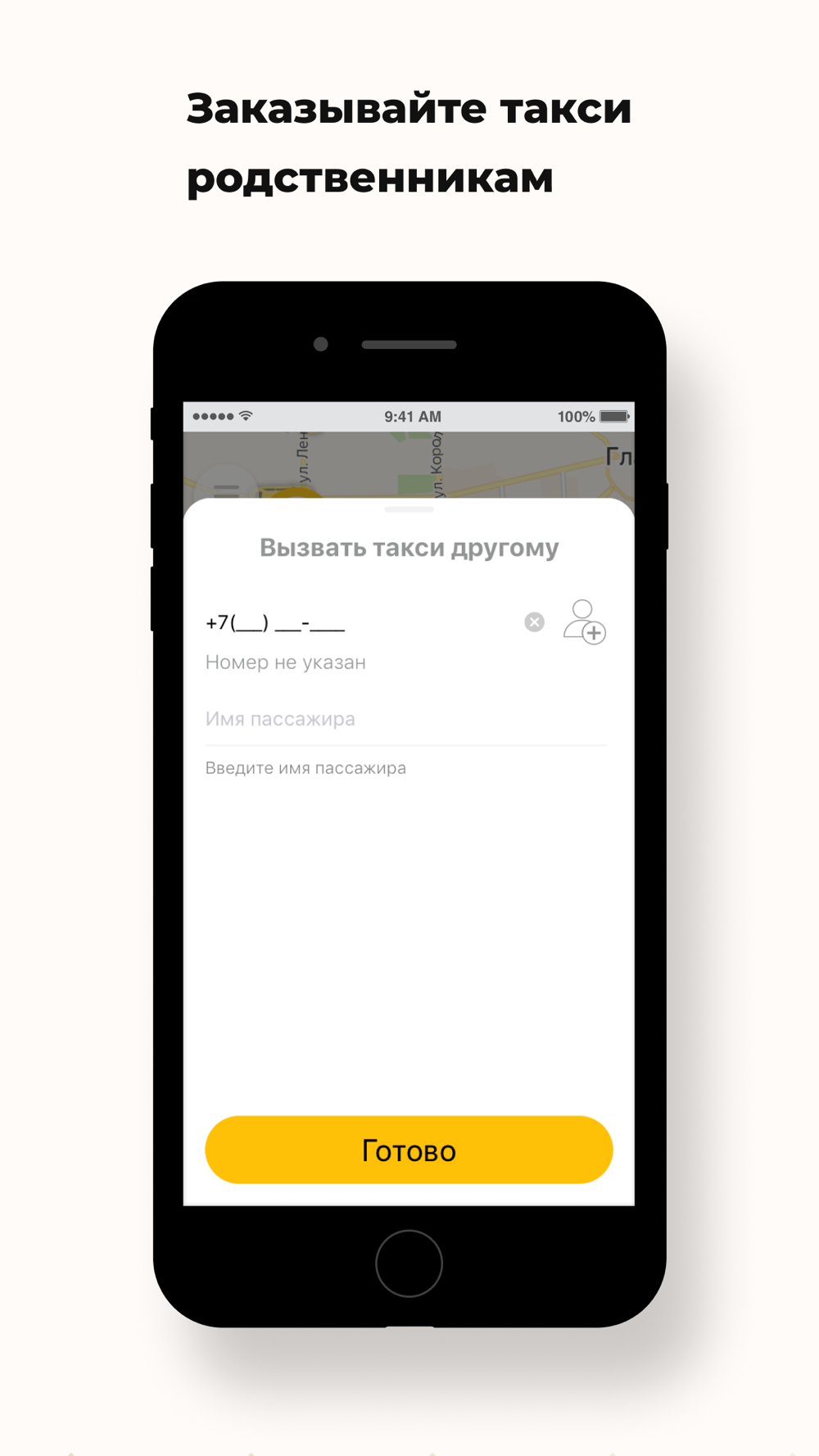 Используйте опцию “Вызвать такси другому” в разделе “Пожелания” и укажите его номер телефона. Когда такси подъедет, на указанный номер придет СМС, а вам — сообщение в приложении.
