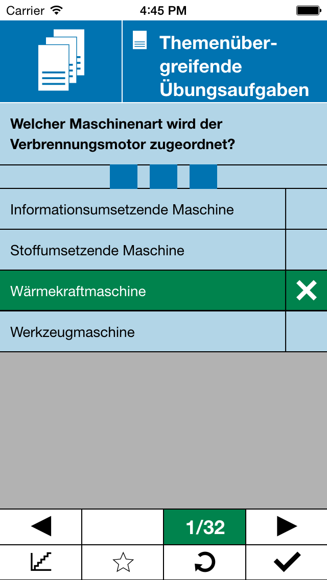 Der Übungsmodus unterteilt sich in die Rubriken Themen, Boxen, Favoriten. In der Rubrik Themen können Sie Prüfungsaufgaben aus verschiedenen Themenbereichen üben. Im Bereich Boxen können Sie alle Fragen nach dem Prinzip „Lernkartei“ bearbeiten. In den Bereichen Themen und Boxen haben Sie die Möglichkeit einzelne Fragen zu Ihren Favoriten hinzuzufügen und in der Rubrik Favoriten separat zu bearbeiten. Zusätzlich können Sie in den verschiedenen Übungsmodi Ihren aktuellen Lernstand abrufen.