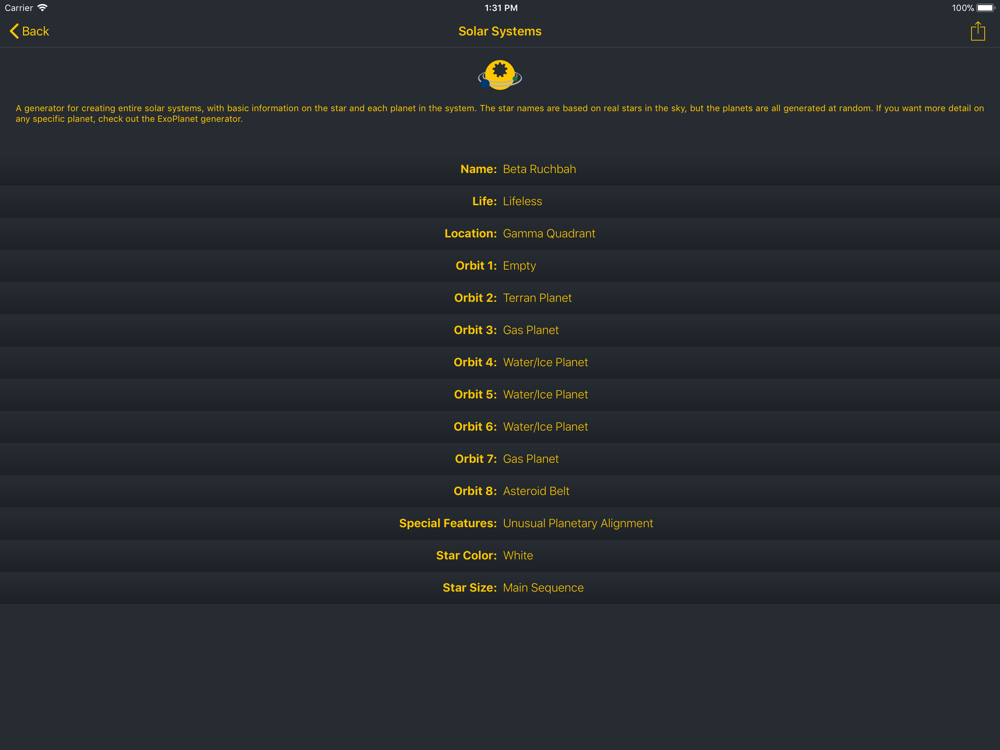 - Each monster, planet, unit, culture, etc. that you create comes pre-equipped with specific information such as name, life type, orbit for solar systems, deployment type for army units, and much more. Anything you need to build your story is pre-included, and changes with each tap of the finger.